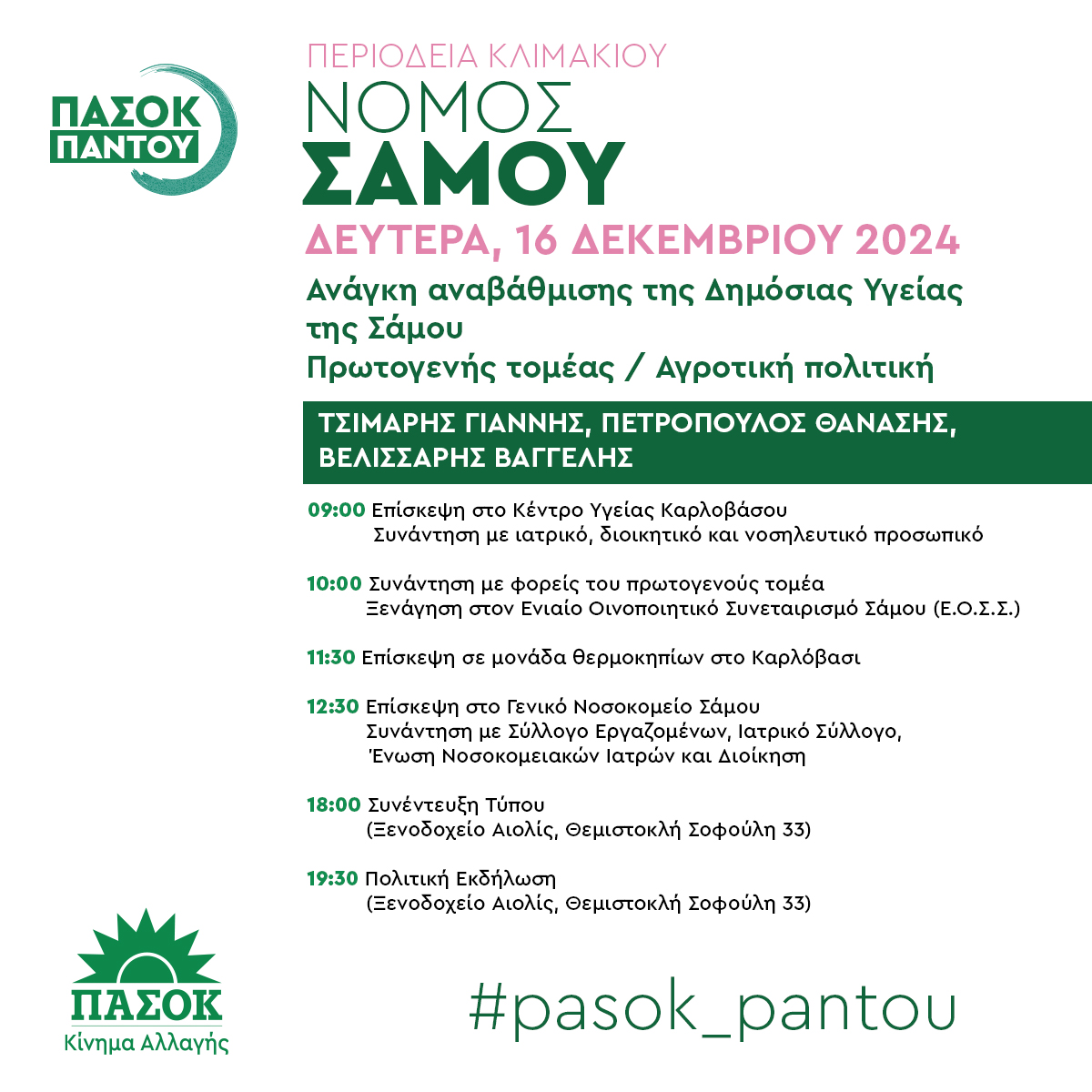 Περιοδεία κλιμακίου του Πανελλήνιου Σοσιαλιστικού Κινήματος με θέματα την “Ανάγκη Αναβάθμισης της Δημόσιας Υγείας της Σάμου” και “Πρωτογενής Τομέας/Αγροτική Πολιτική”, θα πραγματοποιηθεί τη Δευτέρα 16/12/2024 στη Σάμο.