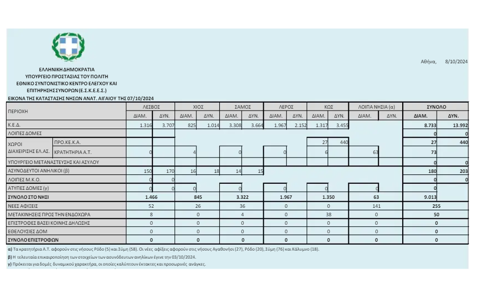 Στη Λέσβο, οι διαμένοντες στην εκεί δομή εκτιμώνται στους 1.316, ενώ στη Χίο, ο αριθμός των διαμενόντων ανέρχεται μόλις στους 825.