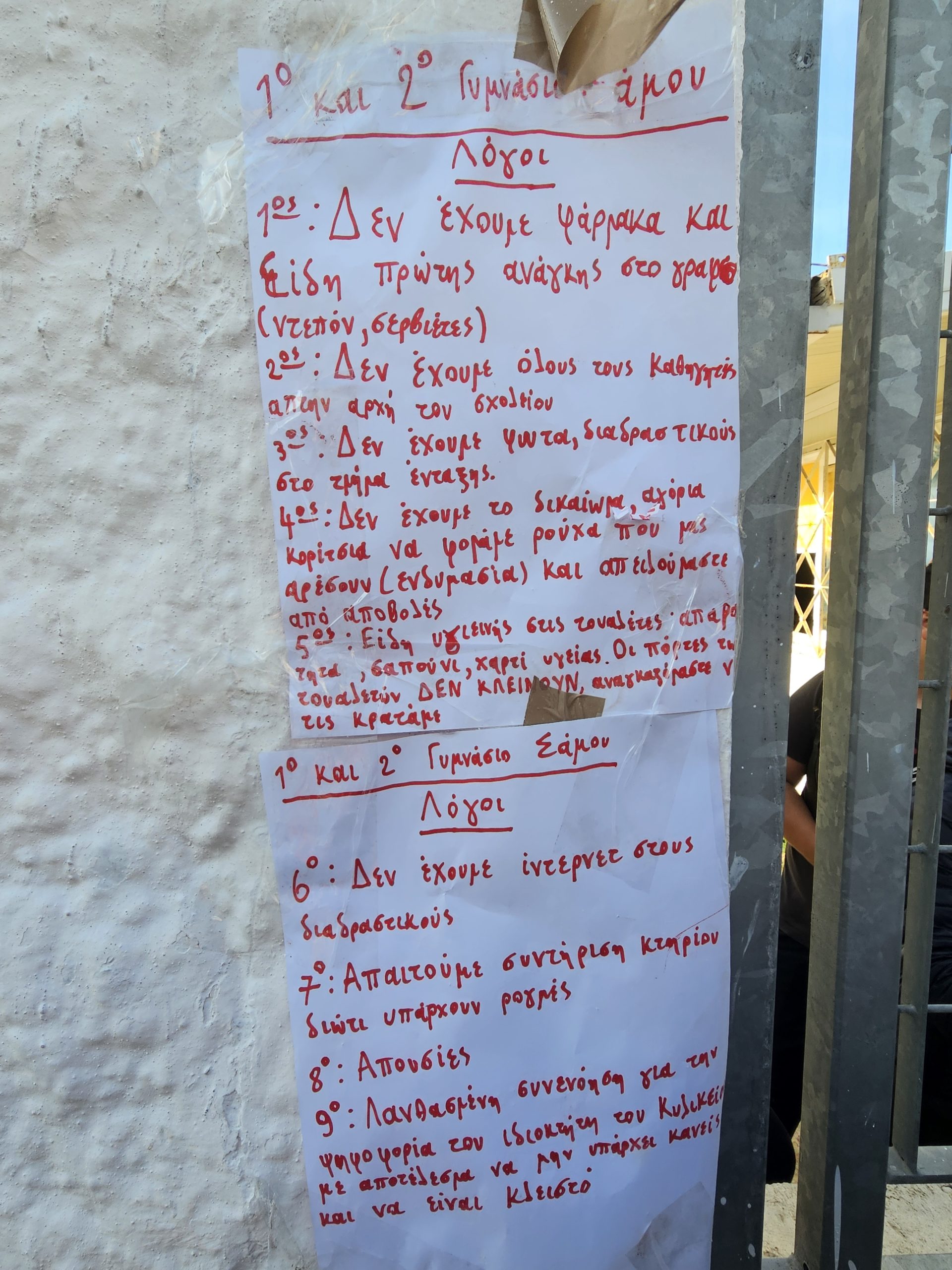 Οι μαθητές του 1ου και 2ου Γυμνασίου Σάμου έχουν προβεί σε κατάληψη, προβάλλοντας μια σειρά αιτημάτων που αφορούν τις συνθήκες εκπαίδευσής τους. Συγκεκριμένα, οι μαθητές διαμαρτύρονται μεταξύ άλλων για την έλλειψη φαρμάκων και βασικών προμηθειών υγιεινής, όπως σαπούνι και χαρτί υγείας, στις τουαλέτες του σχολείου.