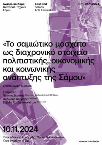 Στα πλαίσια του 5ου «Φεστιβάλ Τεχνών Σάμου – Ανατολικό Άκρο», το οποίο προάγει το πλούσιο ιστορικό, οικονομικό και κοινωνικό παρελθόν του νησιού της Σάμου, καθώς και εκφράσεις της παραδοσιακής και σύγχρονης ζωής των κατοίκων,  διοργανώνεται την Κυριακή 10 Νοεμβρίου 2024 μια ενδιαφέρουσα  ημερίδα για την ουσιαστική συμβολή του «Μοσχάτου Σάμου» στην πολιτιστική κληρονομιά του νησιού μας.