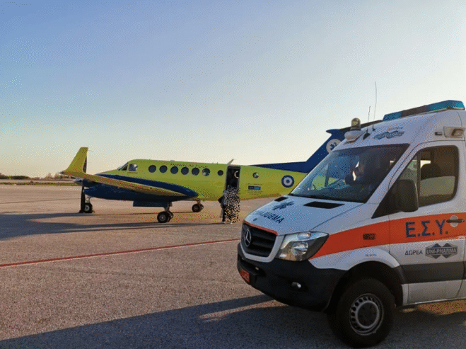 Το κοριτσάκι μεταφέρθηκε με ασθενοφόρο του ΕΚΑΒ  στο αεροδρόμιο και από εκεί διακομίσθηκε στην Αθήνα με πτήση του ΕΚΑΒ.