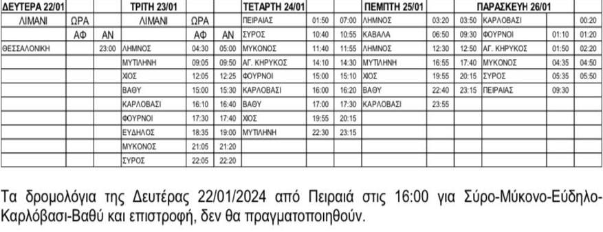 Αναχώρηση από Θεσσαλονίκη τη Δευτέρα 22/01/2024 στις 23:00 (αντί Σάββατο 20/01/2024) και εν συνεχεία σύμφωνα με τον παρακάτω πίνακα: