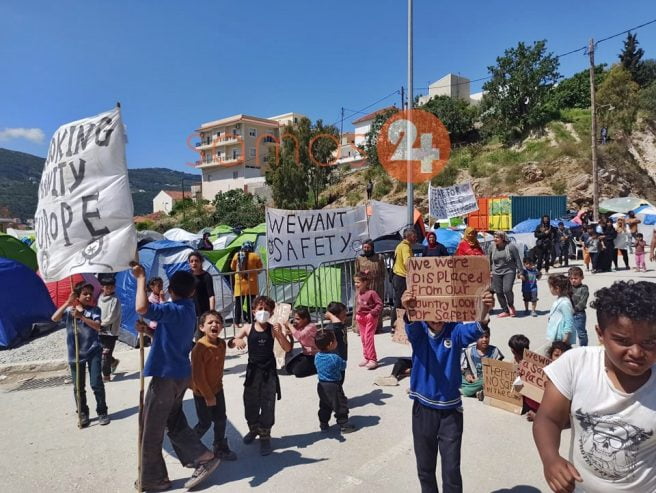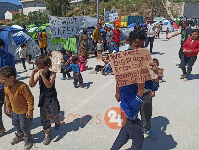 Αρκετά παιδιά μεταναστών που διαμένουν με τις οικογένειες στους στον πρόχειρο καταυλισμό που έχει στηθεί εξωτερικά του Κέντρου Υποδοχής και Ταυτοποίησης στο Βαθύ της Σάμου ,πραγματοποίησαν το πρωί της Τρίτης, διαμαρτυρία.