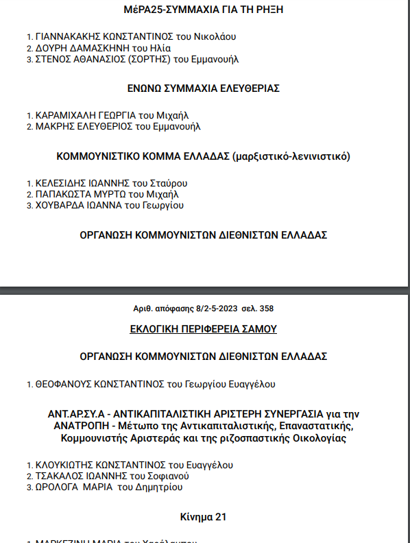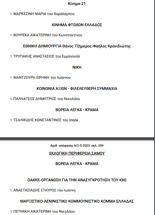 Τα κόμματα και τους υποψήφιους βουλευτές για τις εκλογές της 21ης Μαΐου που ανακήρυξε και επισήμως ο Άρειος Πάγος. Δείτε αναλυτικά ποιοι είναι οι υποψήφιοι βουλευτές στον Ν. Σάμου.