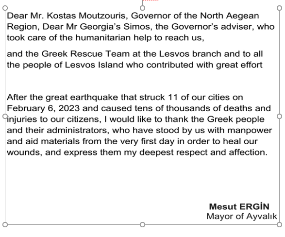 Ευχαριστήριο μήνυμα από τον δήμαρχο Αϊβαλίου, κ. Mesut Ergin, προς τον περιφερειάρχη Βορείου Αιγαίου, κ. Κωνσταντίνο Μουτζούρη, για την ανθρωπιστική βοήθεια που εστάλη στους σεισμοπαθείς της γειτονικής χώρας. Το ευχαριστήριο μήνυμα αναφέρει τα εξής: