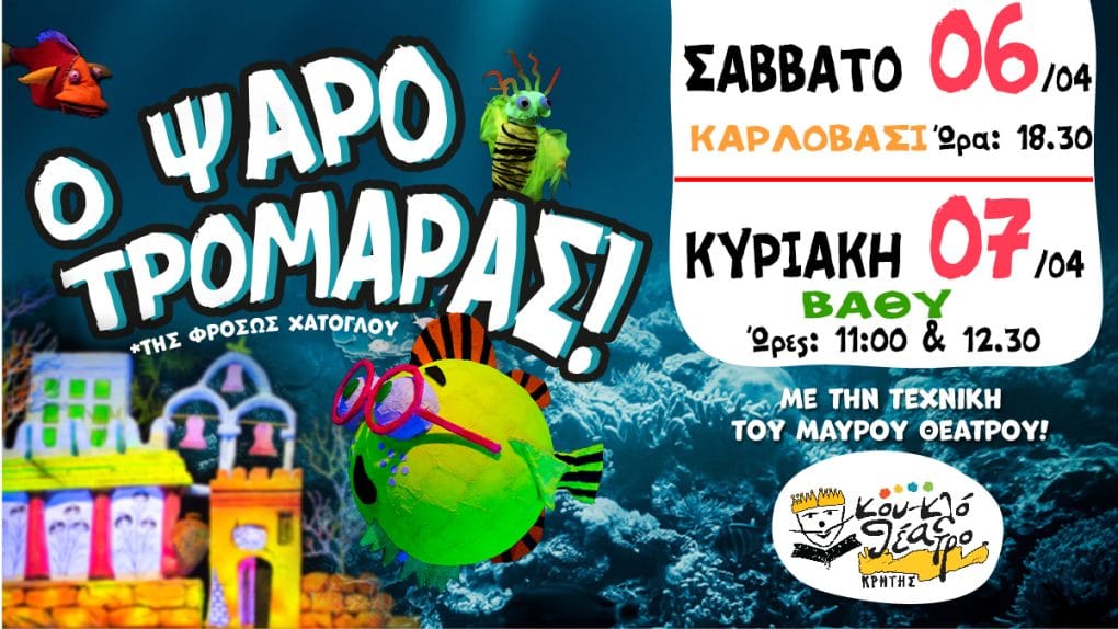 Σας περιμένουμε το Σάββατο 6 Απριλίου στο Καρλόβασι στην αίθουσα εκδηλώσεων του δήμου στην πλατεία Βαλασκατζή , για μία παράσταση στις 18:30 το απόγευμα με το έργο “Ο Ψαροτρομάρας”.