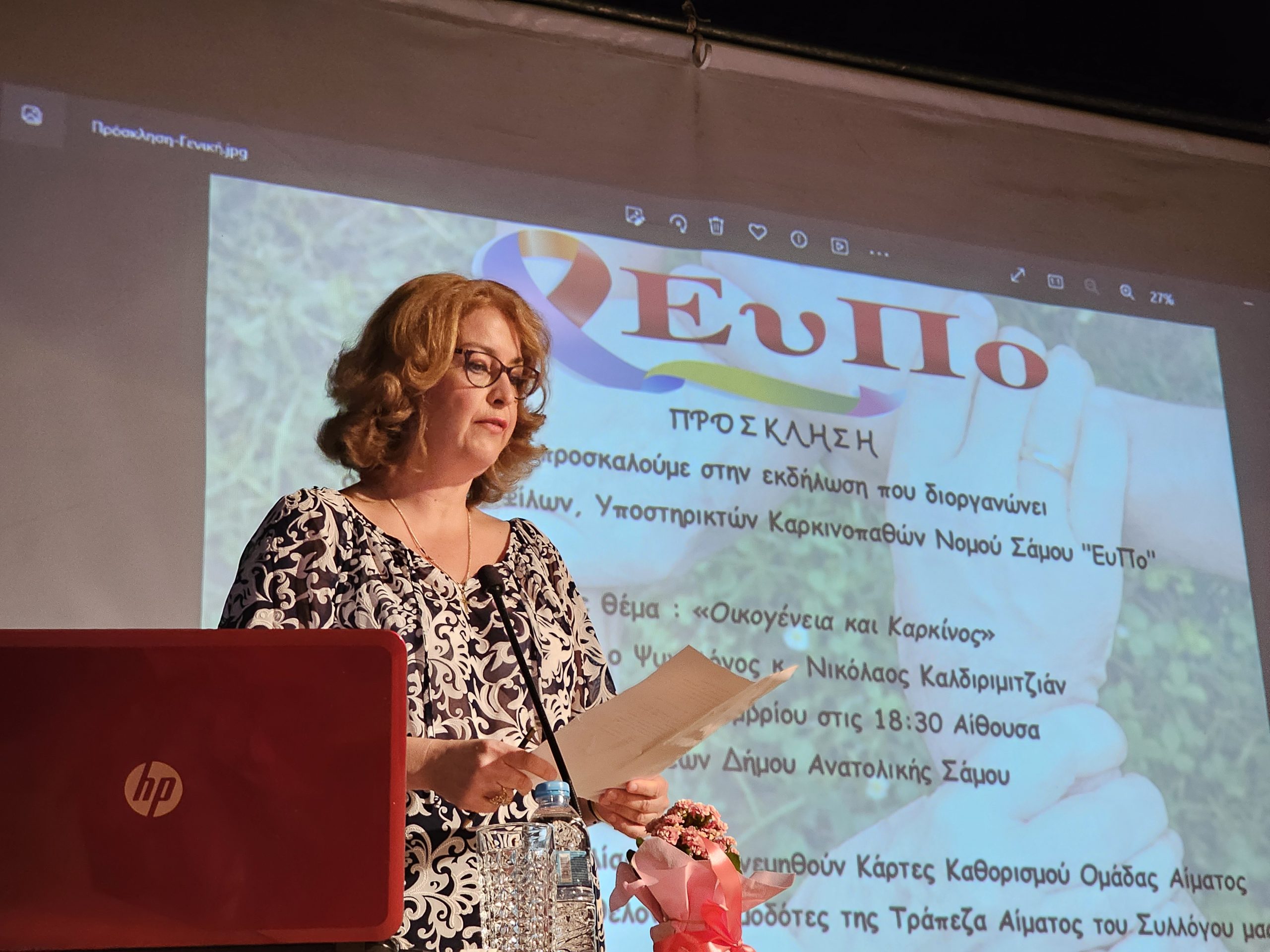Στον χαιρετισμό της η πρόεδρος του Συλλόγου Φίλων, Υποστηρικτών Καρκινοπαθών Νομού Σάμου, κ. Θεοδώρα Παπαδάμ , αναφέρθηκε στην αξία της ενημέρωσης και της πρόληψης τονίζοντας ότι «είναι μέρα χαράς και συγκίνησης. Εδώ χτυπά δυνατά η καρδιά μας για την πρώτη μας επίσημη εκδήλωση που γίνεται εντός του πρώτου ημερολογιακού χρόνου της δημιουργίας του Συλλόγου. Έχουμε ξεκινήσει θεωρούμε αρκετά δυναμικά και διεκδικούμε καθημερινά τα δικαιώματά μας στην Υγεία αλλά και στη Ζωή».
