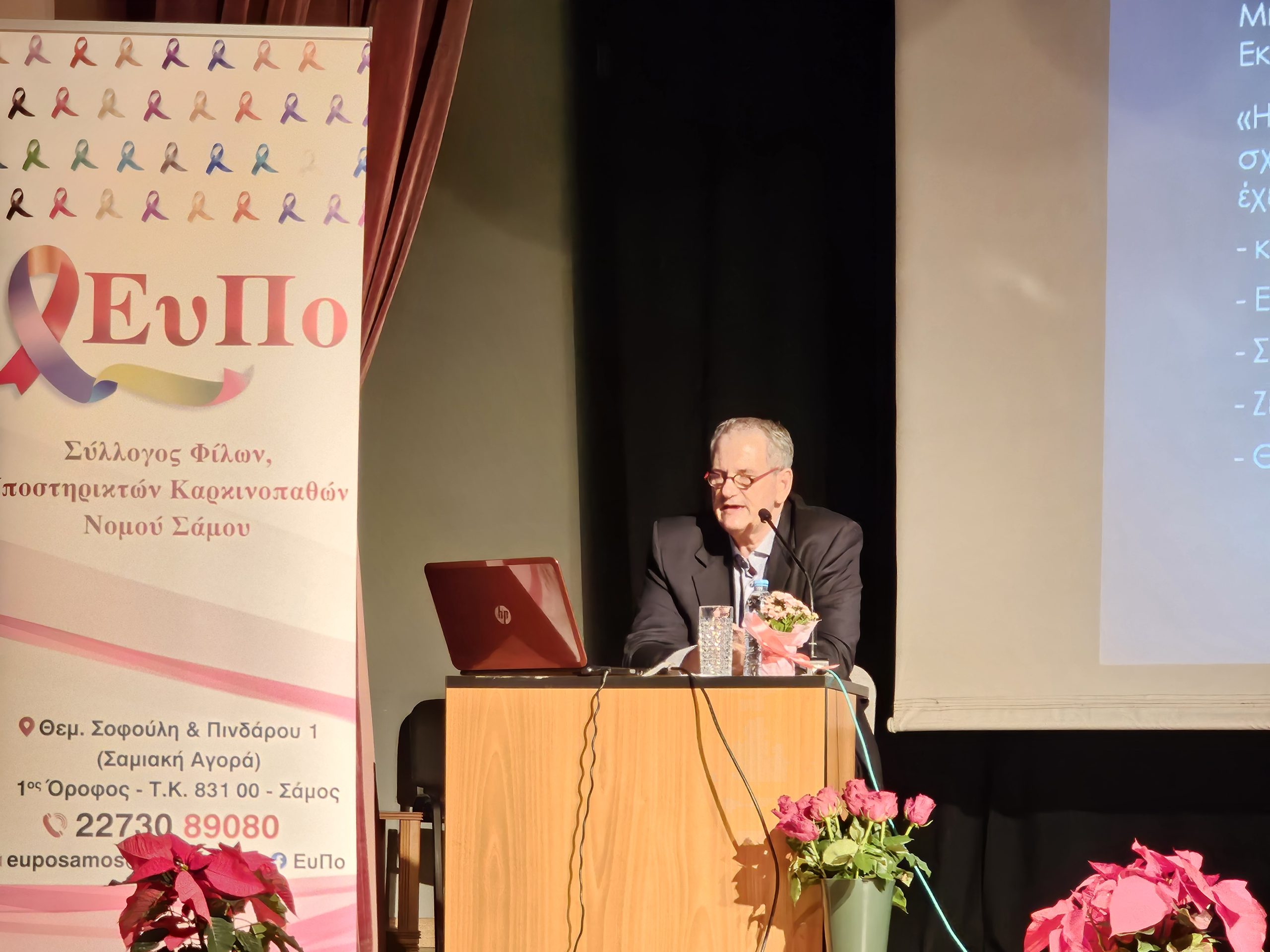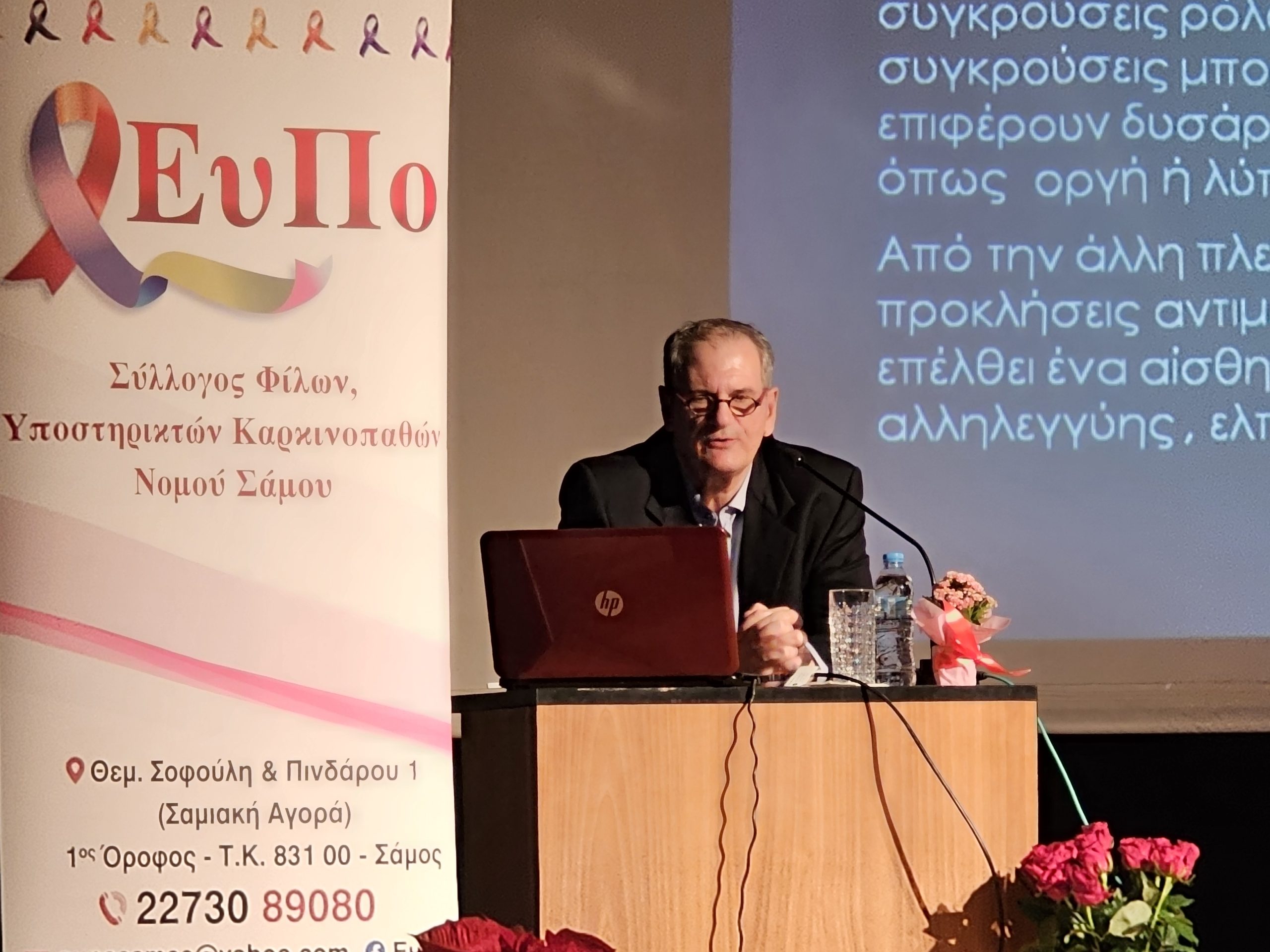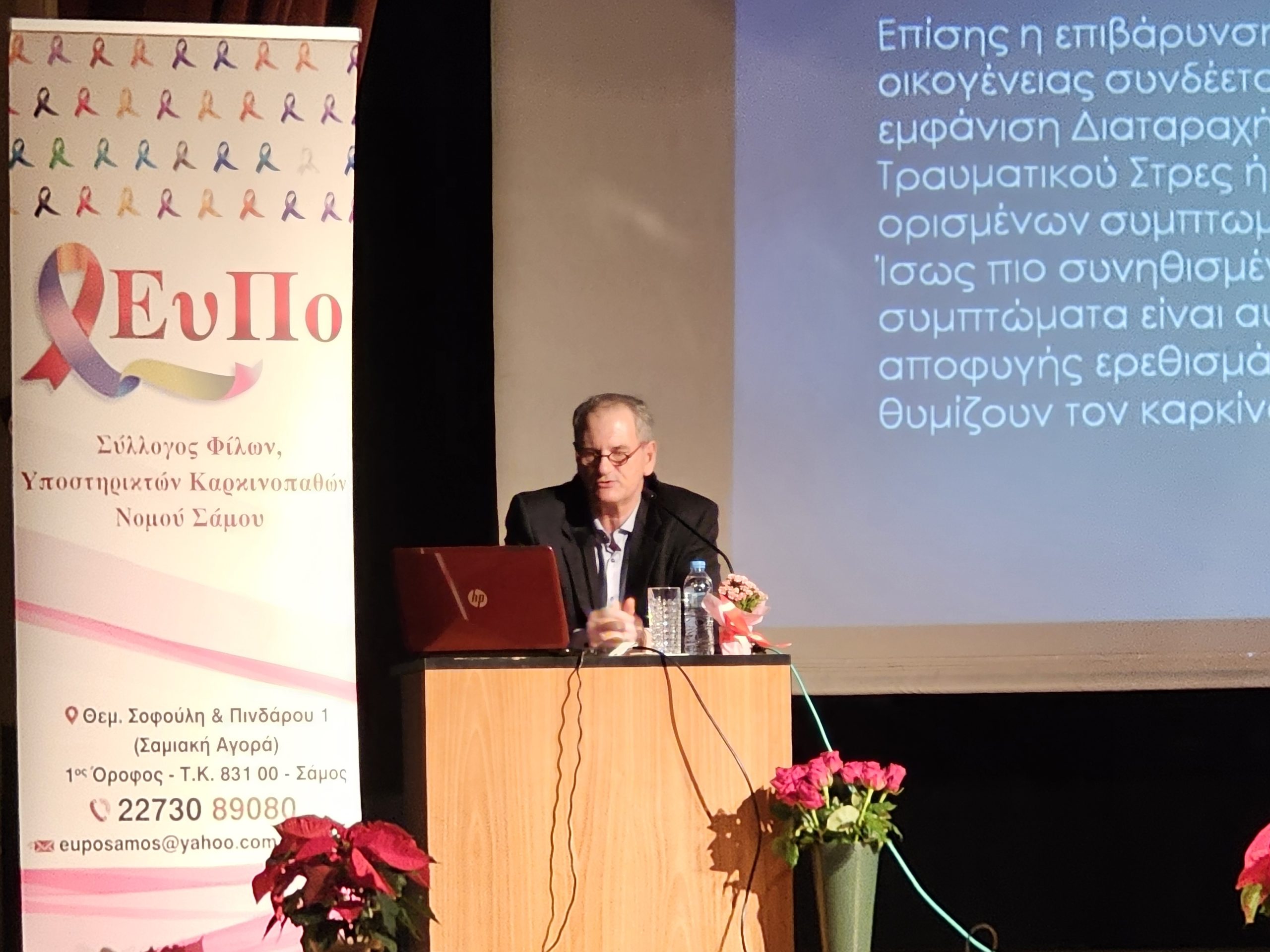 Θερμή η ανταπόκριση του κοινού στην πρώτη ενημερωτική εκδήλωση του Συλλόγου Φίλων, Υποστηρικτών Καρκινοπαθών Νομού Σάμου “ΕυΠο” με θέμα “Οικογένεια και Καρκίνος” με ομιλητή τον ψυχολόγο κ. Νικόλαο Καλδιριμιτζιάν,που πραγματοποιήθηκε το Σάββατο 2 Δεκεμβρίου στην αίθουσα εκδηλώσεων του Δήμου Ανατολικής Σάμου.