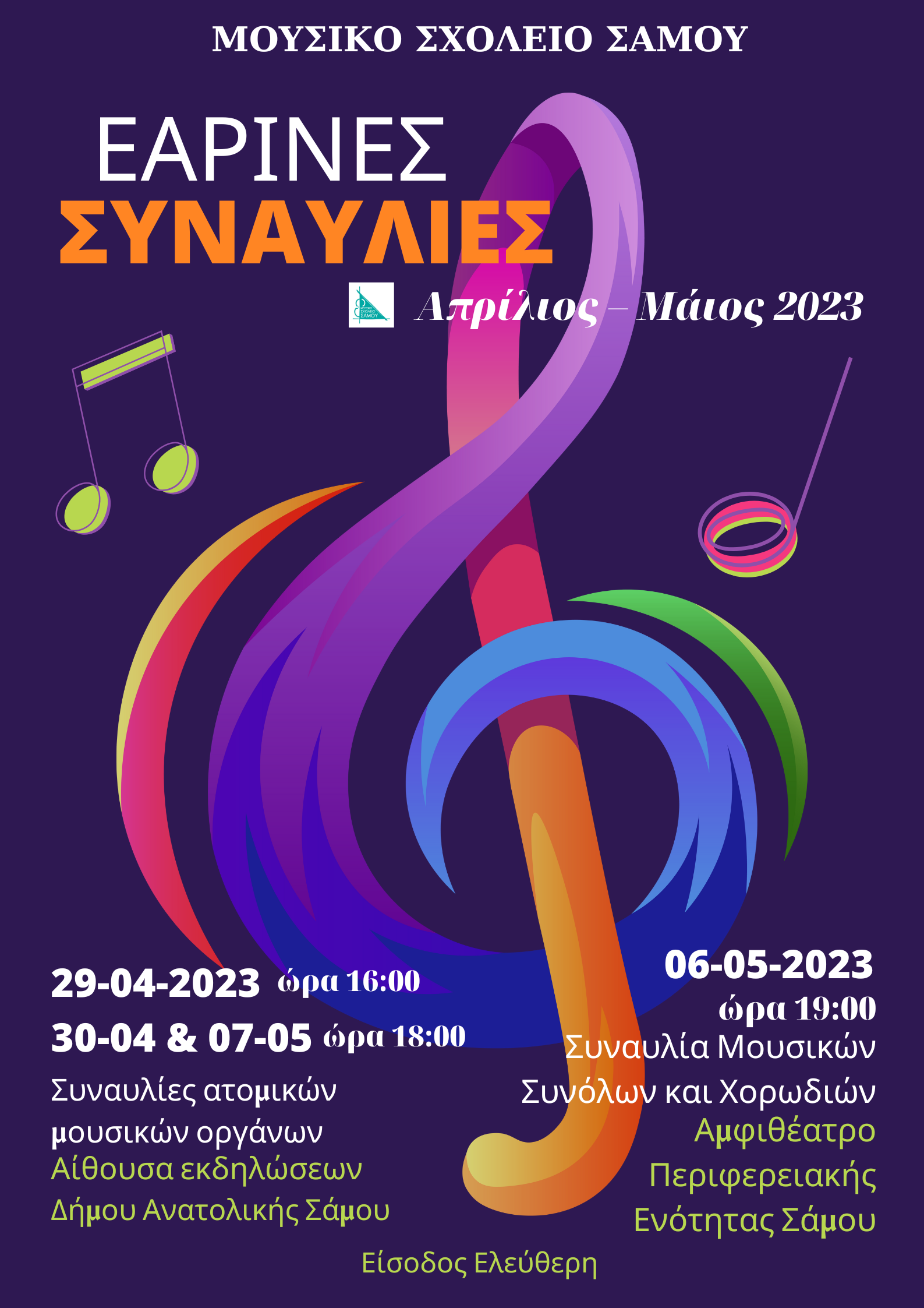 Το Μουσικό Σχολείο Σάμου διοργανώνει μια σειρά από εαρινές συναυλίες τον Απρίλιο και Μάιο 2023, όπου θα παρουσιαστούν τα μουσικά σύνολα του σχολείου, οι χορωδίες, καθώς και ατομικά μουσικά όργανα των διδασκόμενων τάξεων και σύνολα μουσικής δωματίου. Οι συναυλίες θα πραγματοποιηθούν στην αίθουσα του Δήμου Ανατολικής Σάμου και το Αμφιθέατρο της Περιφέρειας, στις 29, 30 Απριλίου και 6, 7 Μαϊου, με ελεύθερη είσοδο για το κοινό. Πιο συγκεκριμένα: