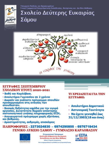 Οι εγγραφές συνεχίζονται για όλο το Σεπτέμβριο του 2020 και για  περισσότερες πληροφορίες οι ενδιαφερόμενοι μπορούν να τηλεφωνούν στα  2273024830, 6974290800, 6976718434 ή να επισκέπτονται την ιστοσελίδα  του Σχολείου Δεύτερης Ευκαιρίας.