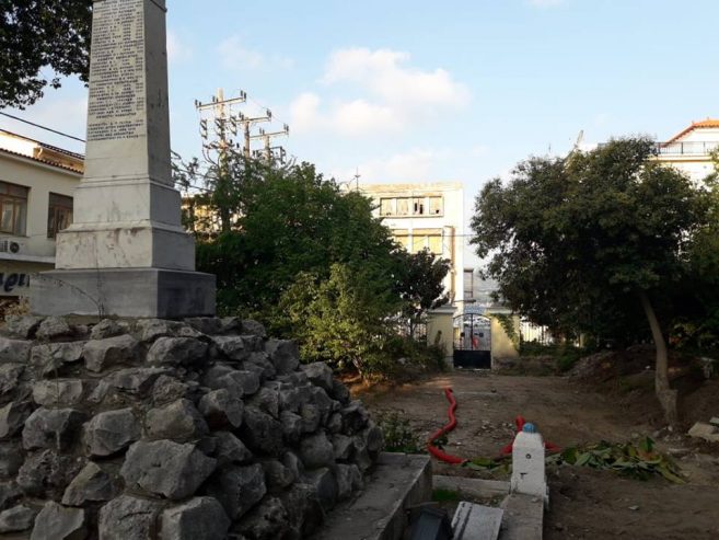 Δημιουργείται μια «περιοχή» με καθιστικά – ζαρντινιέρες από εμφανές μπετόν γύρω από το υπάρχον μνημείο και δύο κυκλικές πλατείες στον άξονα της κάτω εισόδου και δεξιά από τον άξονα της πλατείας. Στην συμβολή της πλατείας με τον διάδρομο που οδηγεί στην παιδική χαρά, τοποθετείται μία πέργκολα σε γκρι ανθρακί χρώμα, στην οποία μπορούν να αναπτυχθούν και αναρριχόμενα φυτά. Ίδιες πέργολες μεγαλύτερων διαστάσεων προτείνονται και στο χώρο ανάπτυξης τραπεζοκαθισμάτων πίσω από το μνημείο, επειδή ο χώρος δεν καλύπτεται πλήρως από την σκίαση των δέντρων.