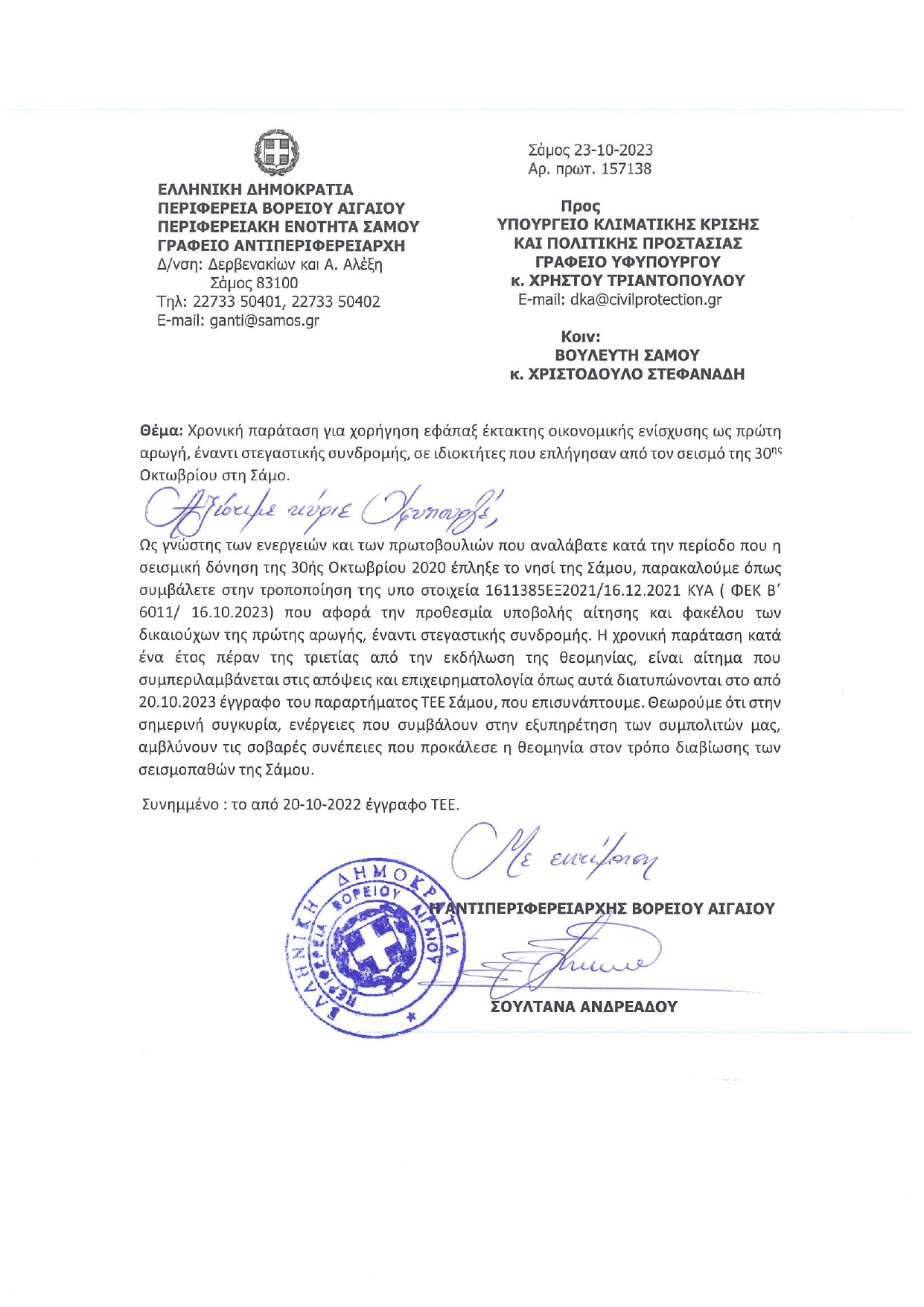 Παράταση προθεσμίας υποβολής αιτήσεων πρώτης αρωγής για τους σεισμόπληκτους ζητά η Π.Ε. και το Τ.Ε.Ε. Σάμου από τον υφυπουργό Κλιματικής Κρίσης και Πολιτικής Προστασίας Χρήστο Τριαντόπουλο.