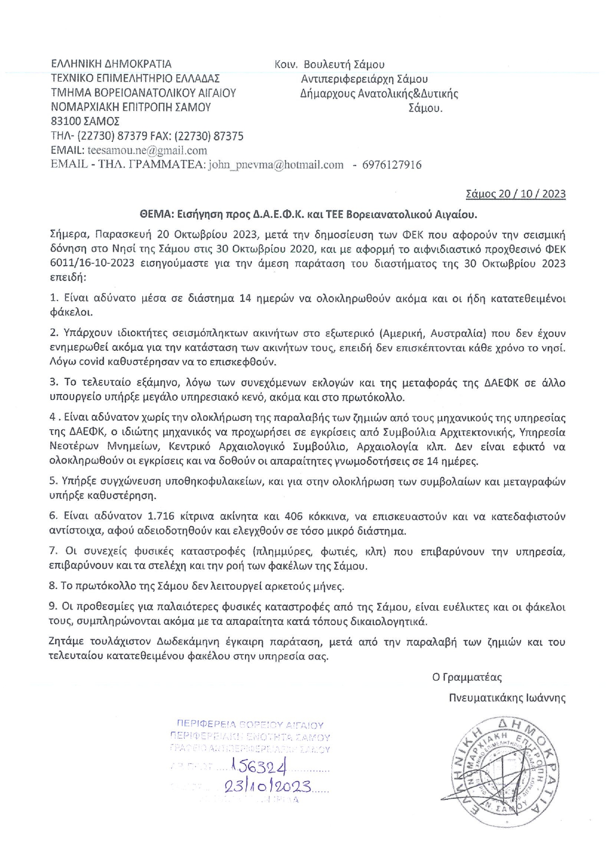 Παράταση προθεσμίας υποβολής αιτήσεων πρώτης αρωγής για τους σεισμόπληκτους ζητά η Π.Ε. Σάμου και το Τ.Ε.Ε. Σάμου