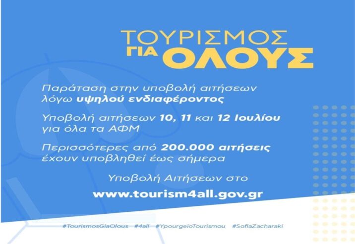 Λόγω της ιδιαίτερα αυξημένης συμμετοχής στο πρόγραμμα “Τουρισμός για Όλους” παρατείνεται έως την Δευτέρα 12/7/2021 η δυνατότητα ηλεκτρονικής υποβολής αίτησης συμμετοχής, μέσω της πλατφόρμας “tourism4all.gov.gr”.