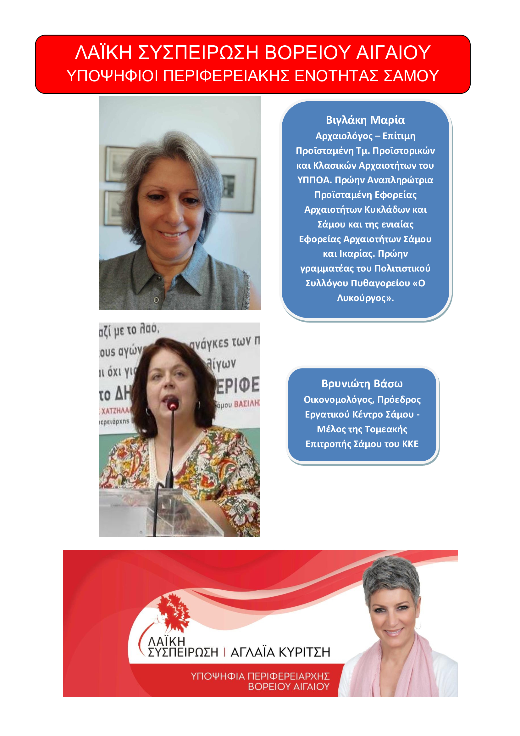 - ΒΡΥΝΙΩΤΗ ΒΑΣΩ Οικονομολόγος – Ιδιωτική υπάλληλος – Πρόεδρος του Εργατικού Κέντρου Σάμου – Μέλος της Τ.Ε. Σάμου του ΚΚΕ
