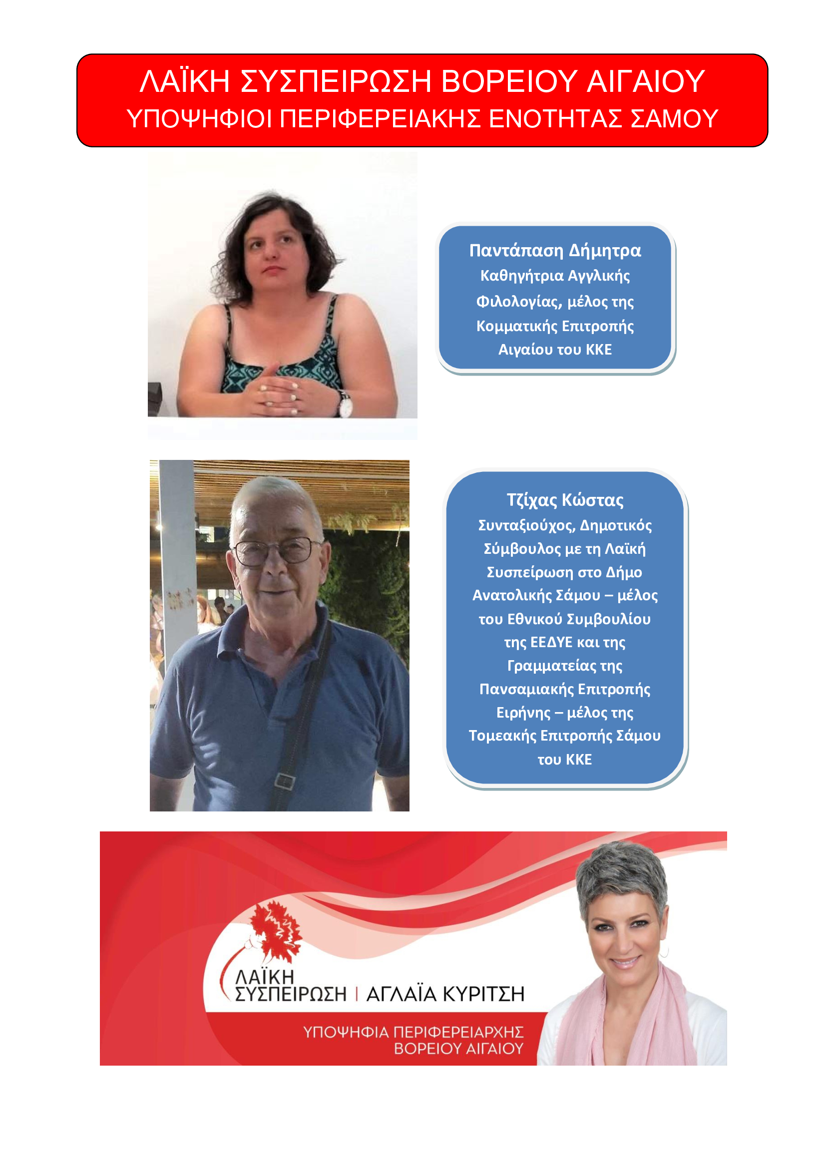 - ΠΑΝΤΑΠΑΣΗ ΔΗΜΗΤΡΑ Καθηγήτρια Αγγλικής Φιλολογίας – Μέλος της Κομματικής Επιτροπής Αιγαίου του ΚΚΕ