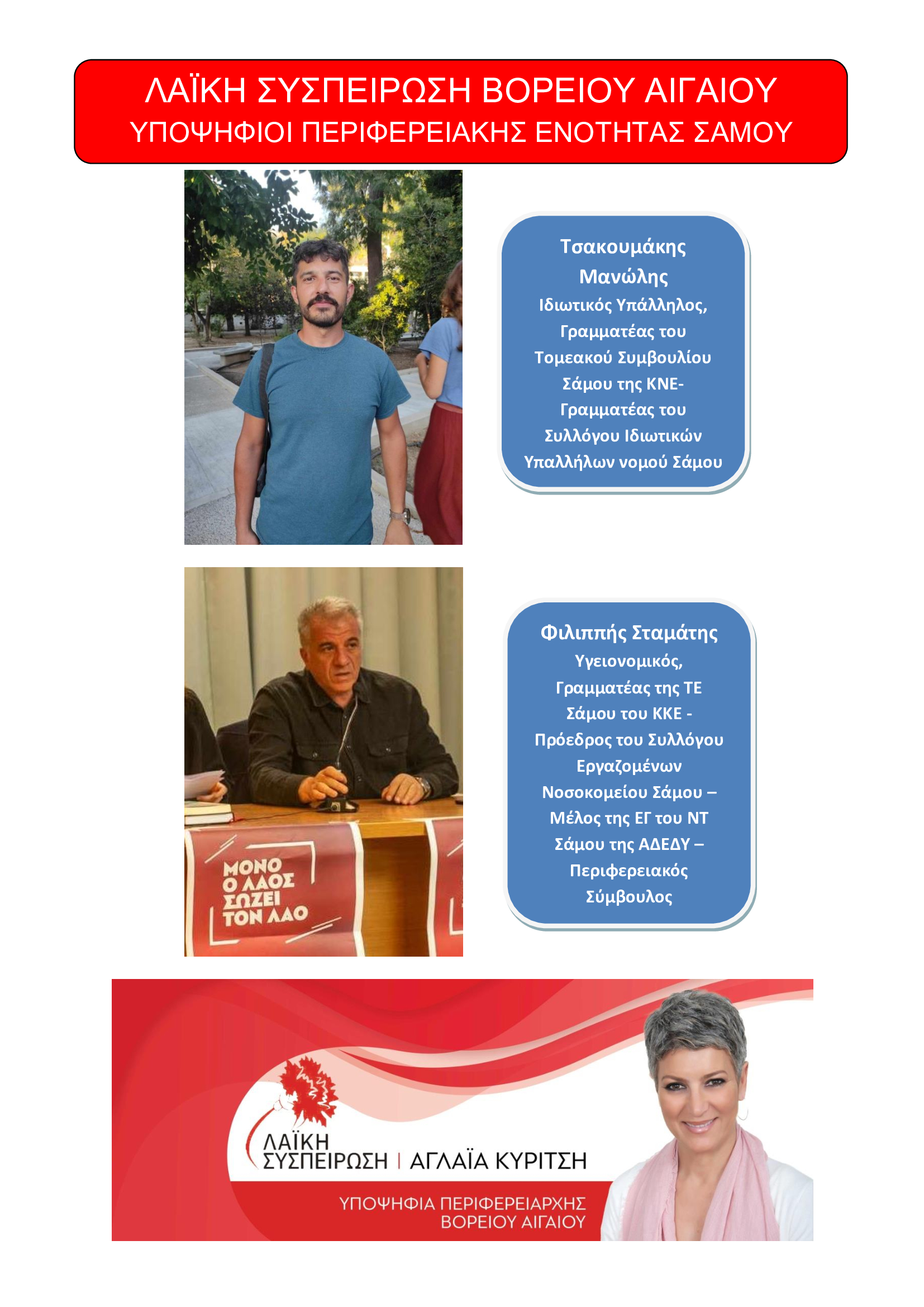 - ΦΙΛΙΠΠΗΣ ΣΤΑΜΑΤΗΣ Υγειονομικός – Γραμματέας της Τ.Ε Σάμου του ΚΚΕ – Πρόεδρος του Συλλόγου Εργαζομένων στο Νοσοκομείο Σάμου – Μέλος της Ε.Γ του Ν.Τ της ΑΔΕΔΥ – Περιφερειακός σύμβουλος.