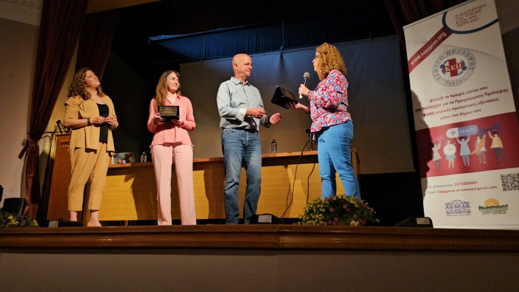 Ο Σύλλογος Φίλων, Υποστηρικτών Καρκινοπαθών Νομού Σάμου «ΕυΠο» τίμησε τους νοσηλευτές Βαΐα Χολέβα και Χριστόδουλο Σοφούλη για τη σημαντική συνεισφορά τους στο Τμήμα Ειδικών Θεραπειών του Γενικού Νοσοκομείου Σάμου. Η βράβευση πραγματοποιήθηκε στην αίθουσα εκδηλώσεων του δημαρχιακού μεγάρου, στο πλαίσιο ενημερωτικής εσπερίδας με θέμα «Πρόληψη και ενημέρωση για τον Καρκίνο του Δέρματος».