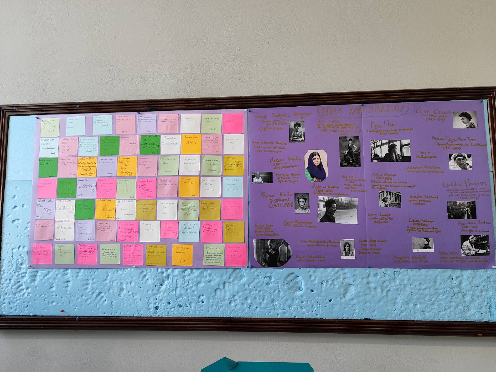 Τα παιδιά βρήκαν πληροφορίες για ιστορικές μορφές γυναικών που διακρίθηκαν στις τέχνες, στα γράμματα, στις επιστήμες, στον φεμινισμό και στην πολιτική. Έγραψαν τα ονόματα και την ιδιότητα των γυναικών σε ένα χαρτόνι με χρυσά γράμματα και πρόσθεσαν αρκετές φωτογραφίες.