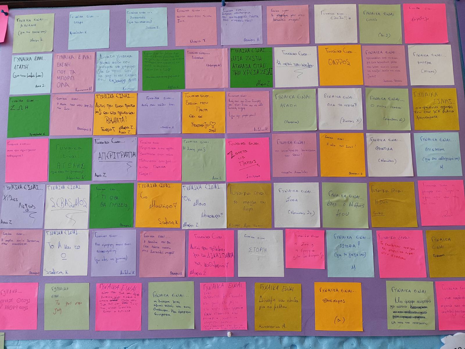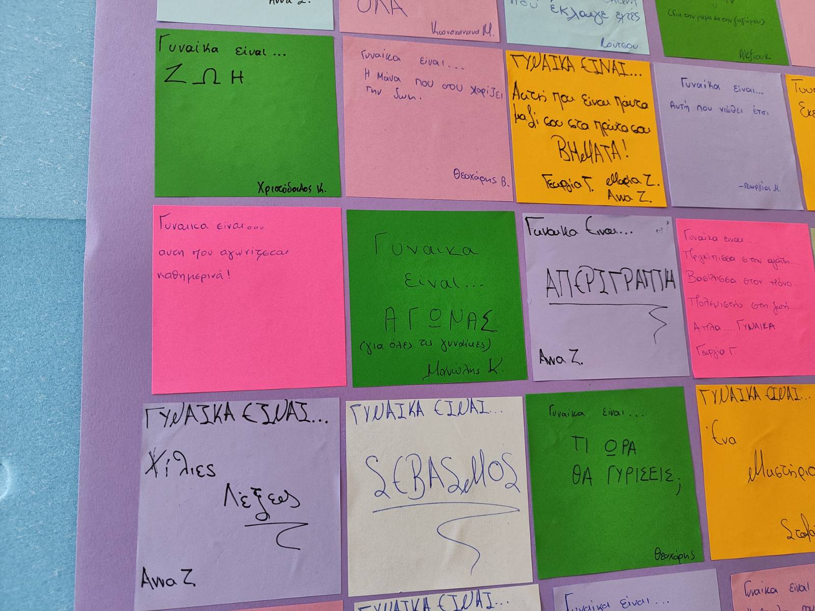 Τα μηνύματά τους ξεκινούσαν με την φράση “ΓΥΝΑΙΚΑ ΕΙΝΑΙ …” και όλα ήταν πολύ συγκινητικά κι εμπνευσμένα. Παράλληλα με την δράση των παιδιών προβαλλόταν βίντεο που αφορούσε τους αγώνες των γυναικών για ισότητα και μπορούσαν να το παρακολουθούν όσοι και όσες έρχονταν στην είσοδο του σχολικού κτιρίου.