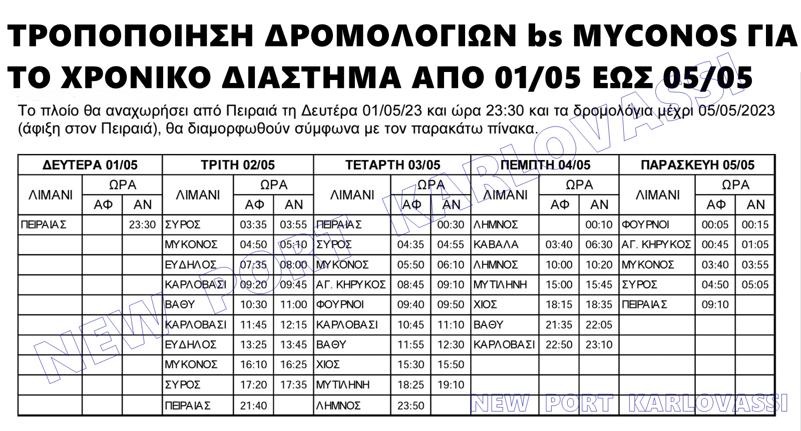 Τροποποίηση των δρομολογίων του bs MYCONOS για το χρονικό διάστημα απο 01/05 έως 05/05 θα έχουμε μιας και το πλοίο θα βρίσκεται την Πρωτομαγιά στο λιμάνι του Πειραιά.