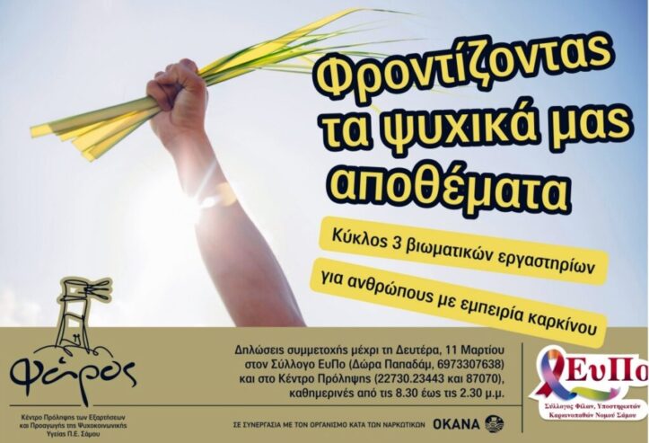 Ο Σύλλογος Φίλων, Υποστηρικτών Καρκινοπαθών Νομού Σάμου ΕυΠο και το Κέντρο Πρόληψης Π.Ε. Σάμου «Φάρος» σχεδιάζουν την πραγματοποίηση ενός κύκλου τριών (3) βιωματικών εργαστηρίων για ανθρώπους με εμπειρία καρκίνου με θέμα: «Φροντίζοντας τα ψυχικά μας αποθέματα».