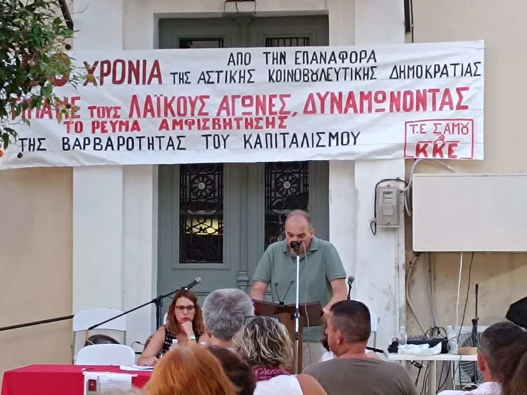 Κύριος ομιλητής ήταν ο Βασίλης Μόσχος, μέλος του Τμήματος Ιστορίας της Κεντρικής Επιτροπής του ΚΚΕ. Ο Μόσχος ανέλυσε τα βασικά χαρακτηριστικά της περιόδου της στρατιωτικής δικτατορίας, τονίζοντας ότι δεν ήταν έργο “αφρόνων αξιωματικών”, αλλά επιλογή της αστικής τάξης με την υποστήριξη των ΗΠΑ και διεθνών οργανισμών.
