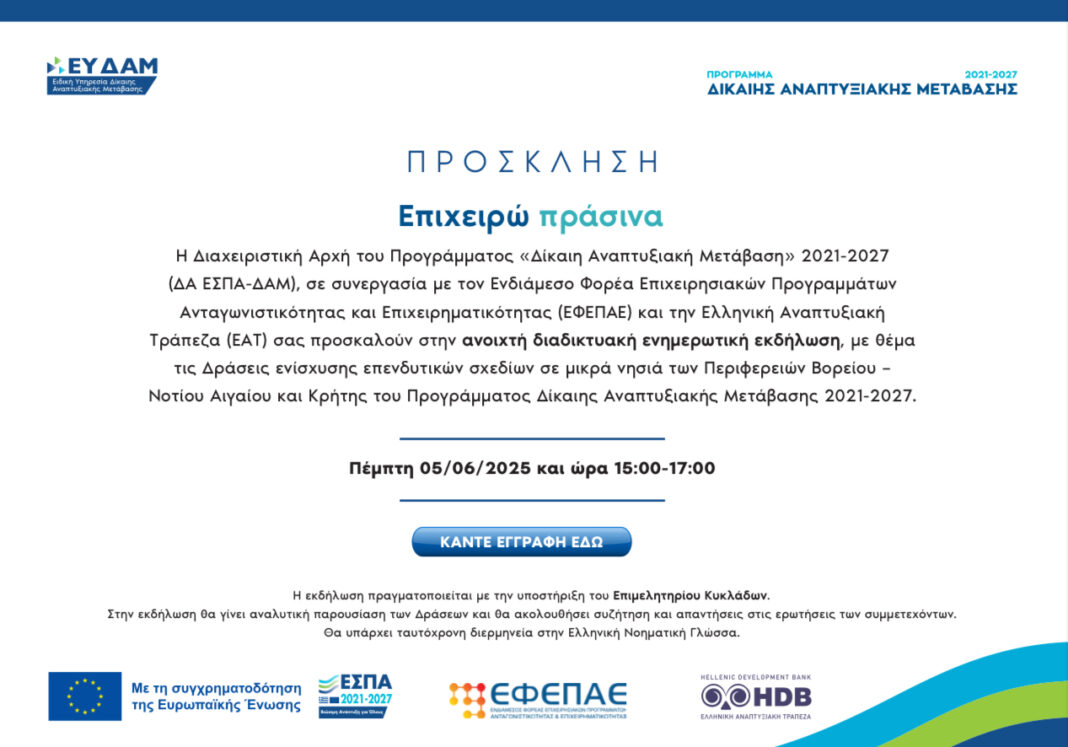 Η Διαχειριστική Αρχή του Προγράμματος «Δίκαιη Αναπτυξιακή Μετάβαση» 2021-2027 (ΔΑ ΕΣΠΑ-ΔΑΜ), σε συνεργασία με τον Ενδιάμεσο Φορέα Επιχειρησιακών Προγραμμάτων Ανταγωνιστικότητας και Επιχειρηματικότητας (ΕΦΕΠΑΕ) και την Ελληνική Αναπτυξιακή Τράπεζα (ΕΑΤ) διοργανώνουν τρεις εκδηλώσεις ενημερωτικού χαρακτήρα, με θέμα τις Δράσεις ενίσχυσης επενδυτικών σχεδίων σε μικρά νησιά των Περιφερειών Βορείου-Νοτίου Αιγαίου και Κρήτης του Προγράμματος Δίκαιης Αναπτυξιακής Μετάβασης 2021-2027.