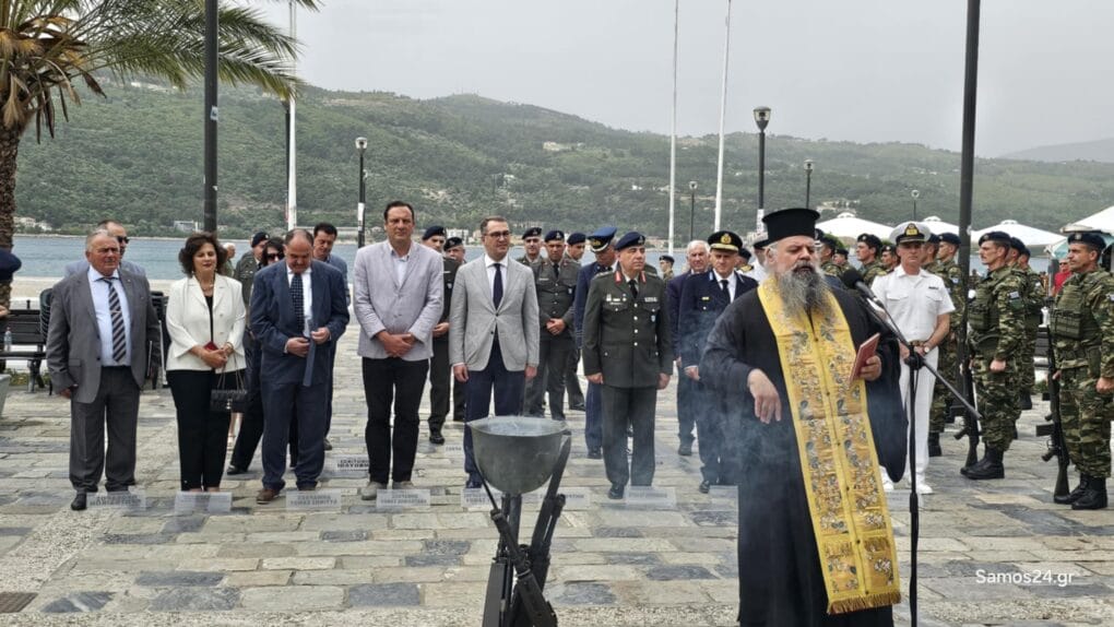 Η ημέρα ξεκίνησε με την Έπαρση της Σημαίας στην Πλατεία Πυθαγόρα, με τη συμμετοχή τμήματος αποδόσεως τιμών και της Στρατιωτικής Μουσικής της 79 ΑΔΤΕ.
