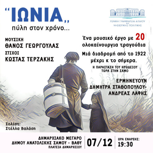 Η παράσταση με τίτλο «ΙΩΝΙΑ πύλη στο χρόνο…» αποτελεί μια ξεχωριστή μουσική παράσταση που έρχεται για πρώτη φορά στη Σάμο. Πρόκειται για ένα ολοκαίνουριο μουσικό έργο με 20 νέα τραγούδια που προσφέρουν μια μουσική διαδρομή από το 1922 μέχρι το σήμερα.