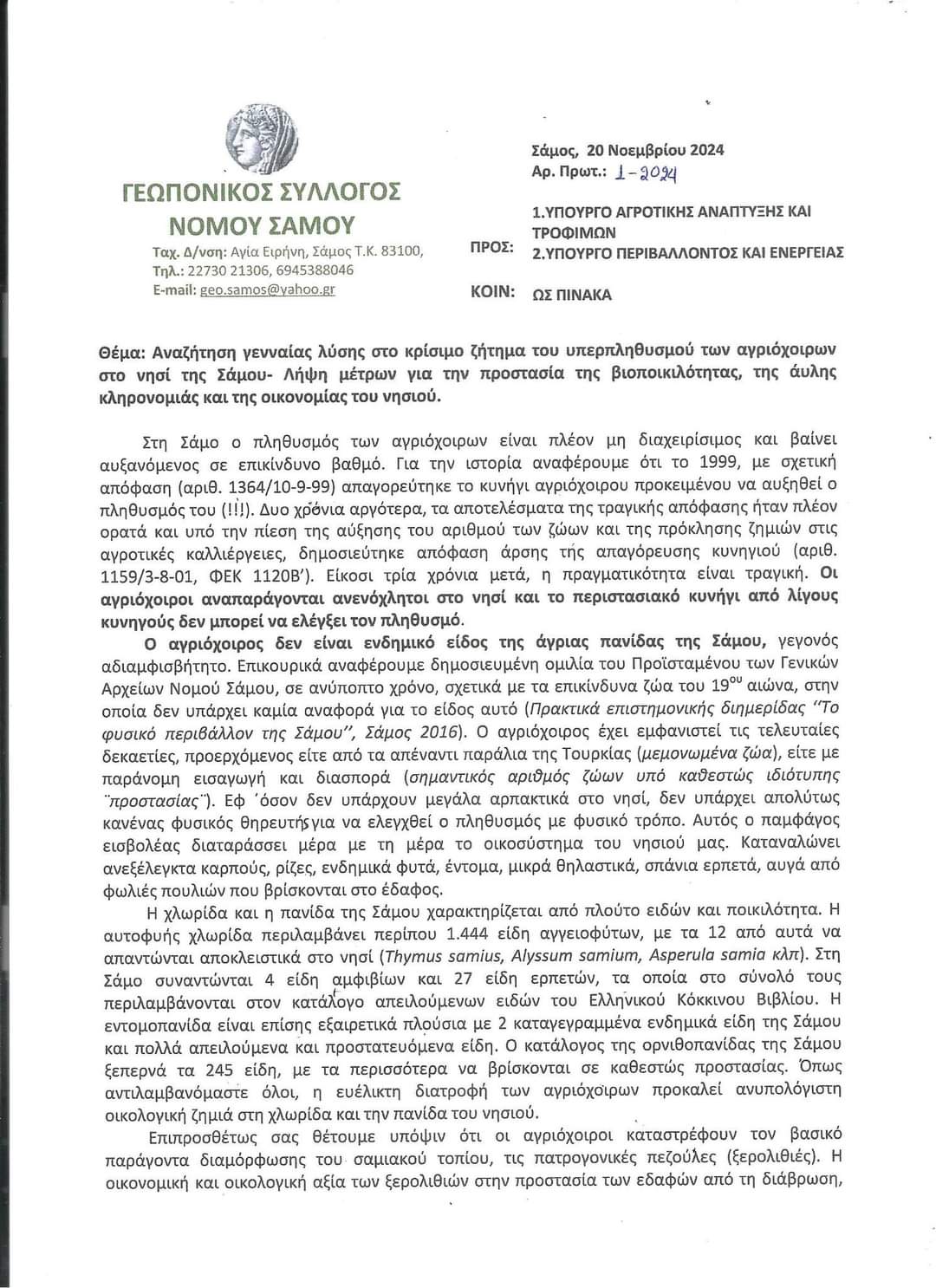 Ο Γεωπονικός Σύλλογος Σάμου απέστειλε επιστολή προς τους αρμόδιους Υπουργούς Αγροτικής Ανάπτυξης και Περιβάλλοντος, σχετικά το κρίσιμο πρόβλημα της αύξησης του πληθυσμού των αγριόχοιρων στο νησί, ζητώντας τη λήψη άμεσων μέτρων για την προστασία της βιοποικιλότητας, της οικονομίας και της άυλης πολιτιστικής κληρονομιάς της Σάμου. Ως μια εισαγόμενη και μη ενδημική μορφή πανίδας, οι αγριόχοιροι προκαλούν πολλαπλές αρνητικές επιπτώσεις στο οικοσύστημα και στους αγροτικούς πόρους του νησιού.