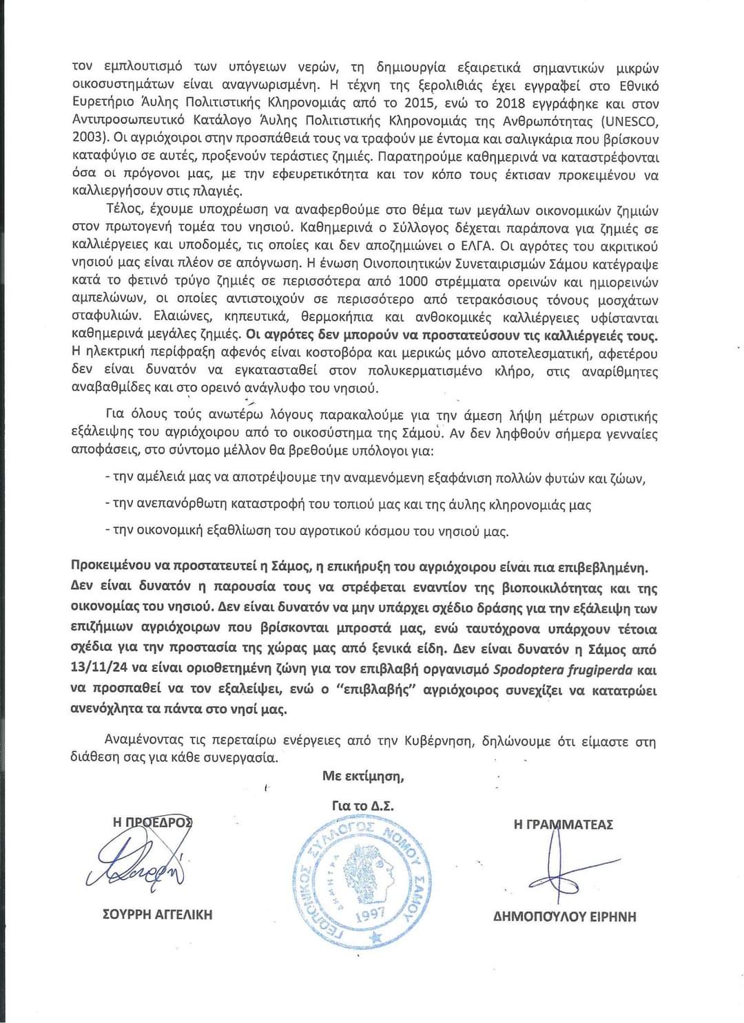 Τέλος, έχουμε υποχρέωση να αναφερθούμε στο θέμα των μεγάλων οικονομικών ζημιών στον πρωτογενή τομέα του νησιού. Καθημερινά ο Σύλλογος δέχεται παράπονα για ζημιές σε καλλιέργειες και υποδομές, τις οποίες και δεν αποζημιώνει o ΕΛΓΑ. ΟΙ αγρότες του ακριτικού νησιού μας είναι πλέον σε απόγνωση. Η ένωση Οινοποιητικών Συνεταιρισμών Σάμου κατέγραψε κατά το φετινό τρύγο ζημιές σε περισσότερα από 1000 στρέμματα ορεινών και ημιορεινών αμπελώνων, οι οποίες αντιστοιχούν σε περισσότερο από τετρακόσιους τόνους μοσχάτων σταφυλιών. Ελαιώνες, κηπευτικά, θερμοκήπια και ανθοκομικές καλλιέργειες υφίστανται καθημερινά μεγάλες ζημιές. ΟΙ αγρότες δεν μπορούν να προστατεύσουν τις καλλιέργειές τους. Η ηλεκτρική περίφραξη αφενός είναι κοστοβόρα και μερικώς μόνο αποτελεσματική, αφετέρου δεν είναι δυνατόν να εγκατασταθεί στον πολυκερματισμένο κλήρο, στις αναρίθμητες αναβαθμίδες και στο ορεινό ανάγλυφο του νησιού.