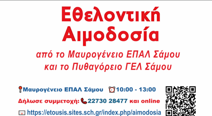 Το Μαυρογένειο ΕΠΑΛ και το Πυθαγόρειο ΓΕΛ Σάμου αναλαμβάνουν πρωτοβουλία να συμβάλουν στην ενίσχυση των αποθεμάτων αίματος, διοργανώνοντας εθελοντική αιμοδοσία την Παρασκευή 21 Φεβρουαρίου 2025, στο χώρο του σχολείου. Με γνώμονα την κοινωνική ευθύνη και την αλληλεγγύη προς τον συνάνθρωπο, καλούμε καθηγητές, γονείς, μαθητές άνω των 18 ετών και κάθε ενδιαφερόμενο πολίτη να συμμετάσχει σε αυτή την πράξη ζωής.