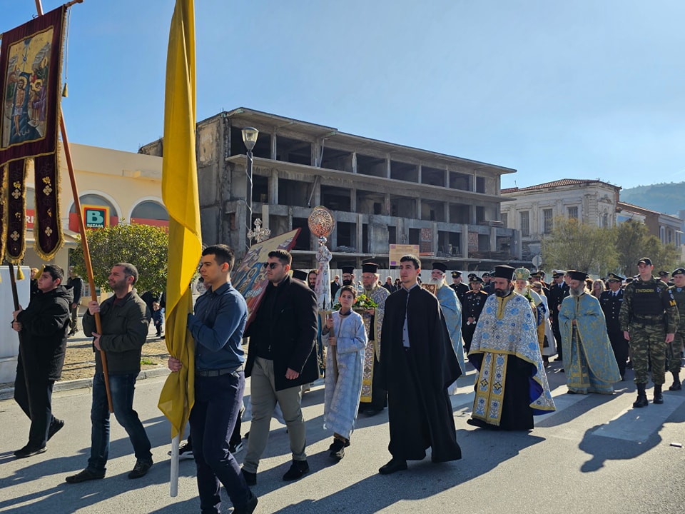 Εν συνεχεία σχηματίστηκε ιερά πομπή και υπό τους ήχους της Φιλαρμονικής «Βαθύλλος» και παρούσια αγήματος του Στρατού μας, κατέληξε στο λιμάνι της πόλεως της Σάμου όπου και πραγματοποιήθηκε η κατάδυσις του Τιμίου Σταυρού.