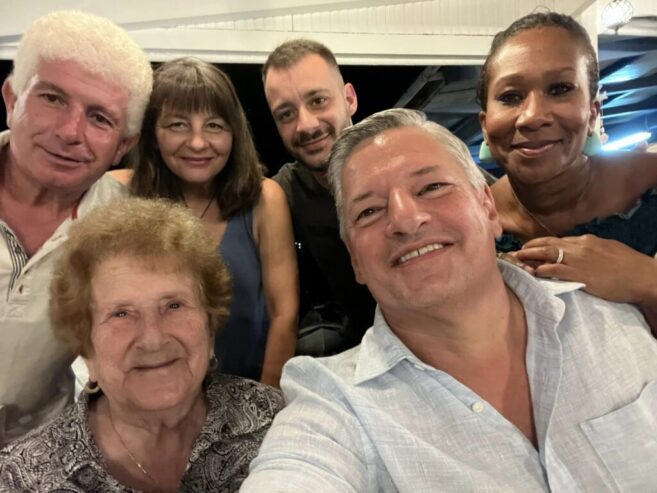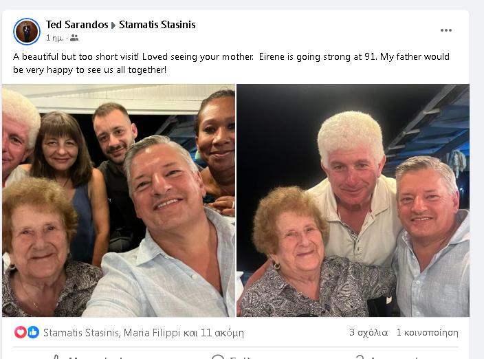 “A beautiful but too short visit! Loved seeing your mother. Eirene is going strong at 91. My father would be very happy to see us all together!” “Μια όμορφη αλλά πολύ σύντομη επίσκεψη! Χάρηκα που είδα τη μητέρα σου. Η Ειρήνη είναι δυνατή στα 91 της. Ο πατέρας μου θα ήταν πολύ χαρούμενος να μας δει όλους μαζί!”