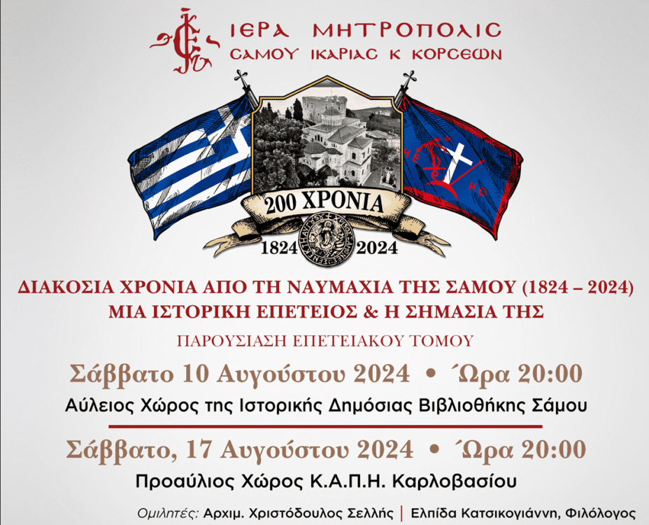 Η Ιερά Μητρόπολη Σάμου, Ικαρίας και Κορσεών θα παρουσιάσει το νέο επετειακό τόμο με τίτλο «ΧΡΙΣΤΟΣ ΣΑΜΟΣ ΕΣΩΣΕΝ ΤΗ 6Η ΑΥΓΟΥΣΤΟΥ 1824: ΓΕΓΟΝΟΤΑ, ΠΡΟΣΩΠΑ, ΜΝΗΜΕΙΑ», με αφορμή τα διακόσια χρόνια από τη Ναυμαχία της Σάμου (1824 – 2024). Η παρουσίαση θα πραγματοποιηθεί σε δύο ξεχωριστές εκδηλώσεις, στις 10 και 17 Αυγούστου 2024.