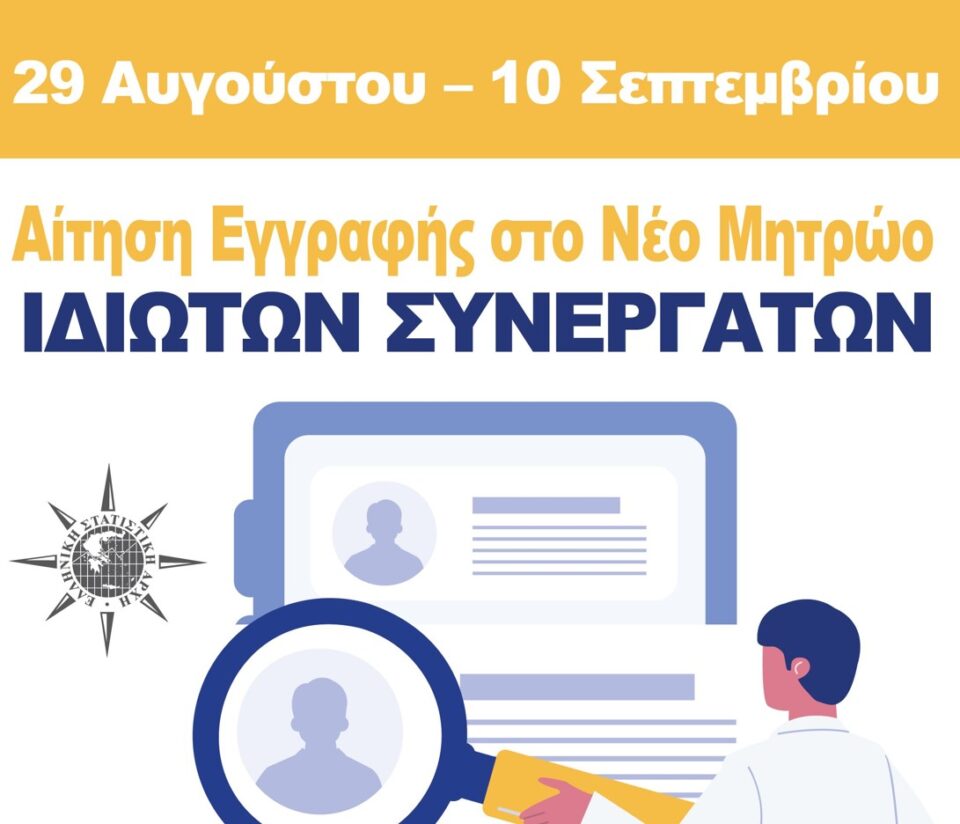 Η ΕΛΣΤΑΤ καλεί τους ενδιαφερόμενους να υποβάλουν ηλεκτρονική αίτηση για την ένταξή τους στο Μητρώο Ιδιωτών Συνεργατών (ΙΣ) περιόδου Σεπτεμβρίου 2025 – Απριλίου 2026.