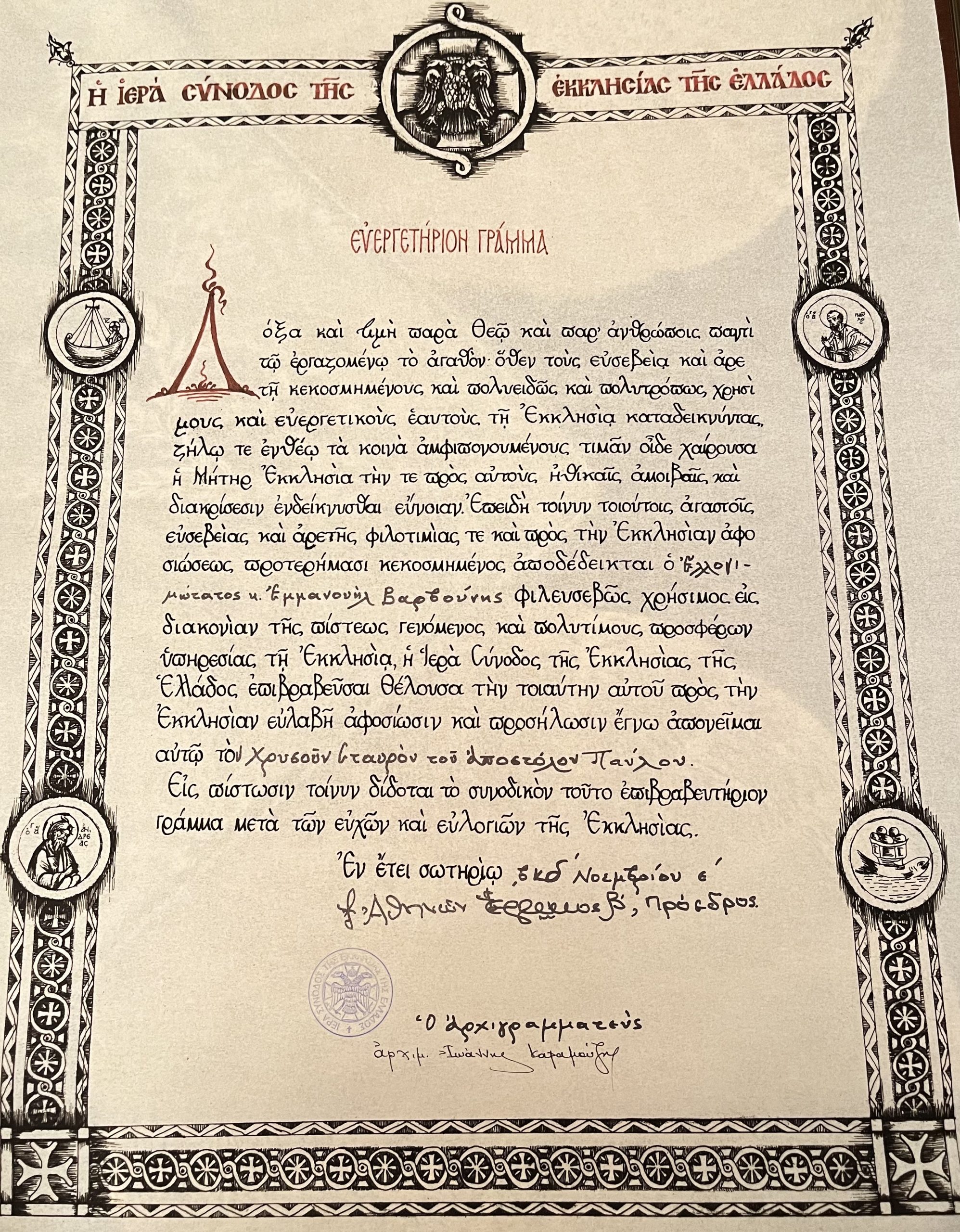 Συνήλθε επί διήμερο, τη Δευτέρα 9 και την Τρίτη 10 Δεκεμβρίου 2024, η Διαρκής Ιερά Σύνοδος της Εκκλησίας της Ελλάδος της 168ης Συνοδικής Περιόδου, υπό την Προεδρία του Μακαριωτάτου Αρχιεπισκόπου Αθηνών και πάσης Ελλάδος κ. Ιερωνύμου. Στο διάλειμμα της Συνεδρίας της Δευτέρας 9ης Δεκεμβρίου, κατόπιν της από 5ης Νοεμβρίου 2024 Συνοδικής Αποφάσεως, ο Μακαριώτατος Αρχιεπίσκοπος Αθηνών και πάσης Ελλάδος κ. Ιερώνυμος απένειμε τον Χρυσό Σταυρό του Παρασήμου του Αποστόλου Παύλου, ο οποίος είναι η ανώτατη τιμητική διάκριση της Εκκλησίας της Ελλάδος, στον Καθηγητή κ. Εμμανουήλ Βαρβούνη, Κοσμήτορα της Σχολής Κλασικών και Ανθρωπιστικών Σπουδών του Δημοκριτείου Πανεπιστημίου Θράκης, για τη σύνολη προσφορά του στην Ειδική Συνοδική Επιτροπή Πολιτιστικής Ταυτότητος, στα διοργανωθέντα από αυτήν Επιστημονικά Συνέδρια και τις άλλες πολιτιστικές εκδηλώσεις, και γενικότερα στις κατά τόπους Ιερές Μητροπόλεις της Εκκλησίας της Ελλάδος.