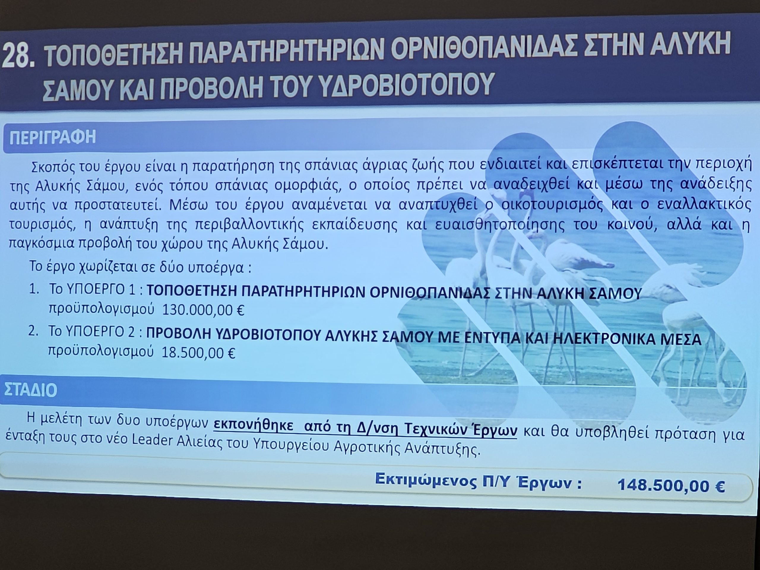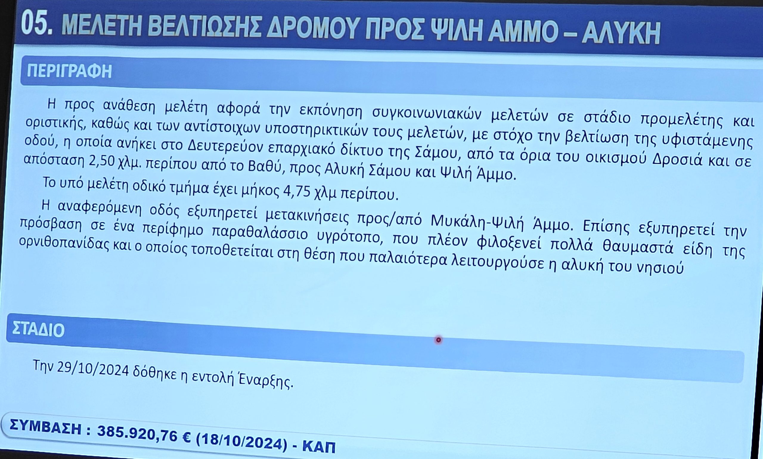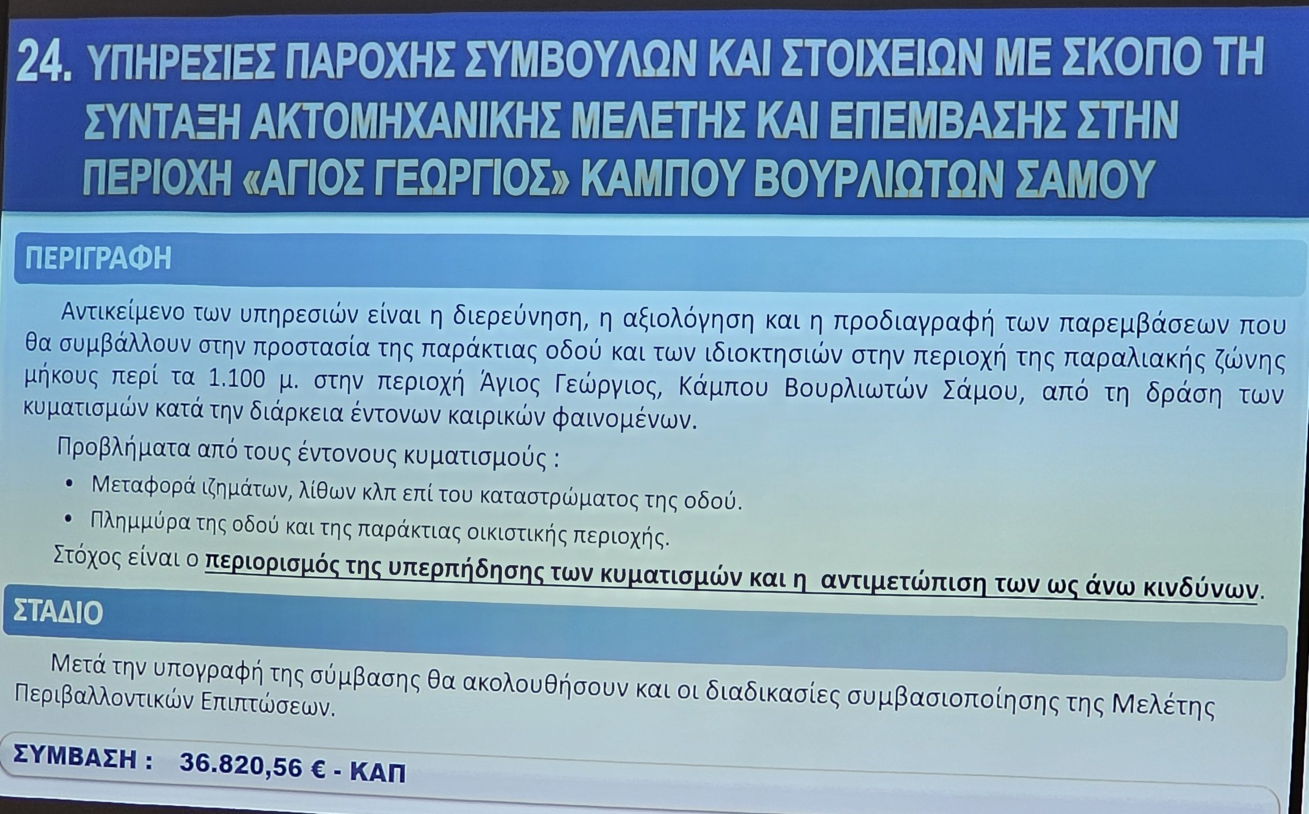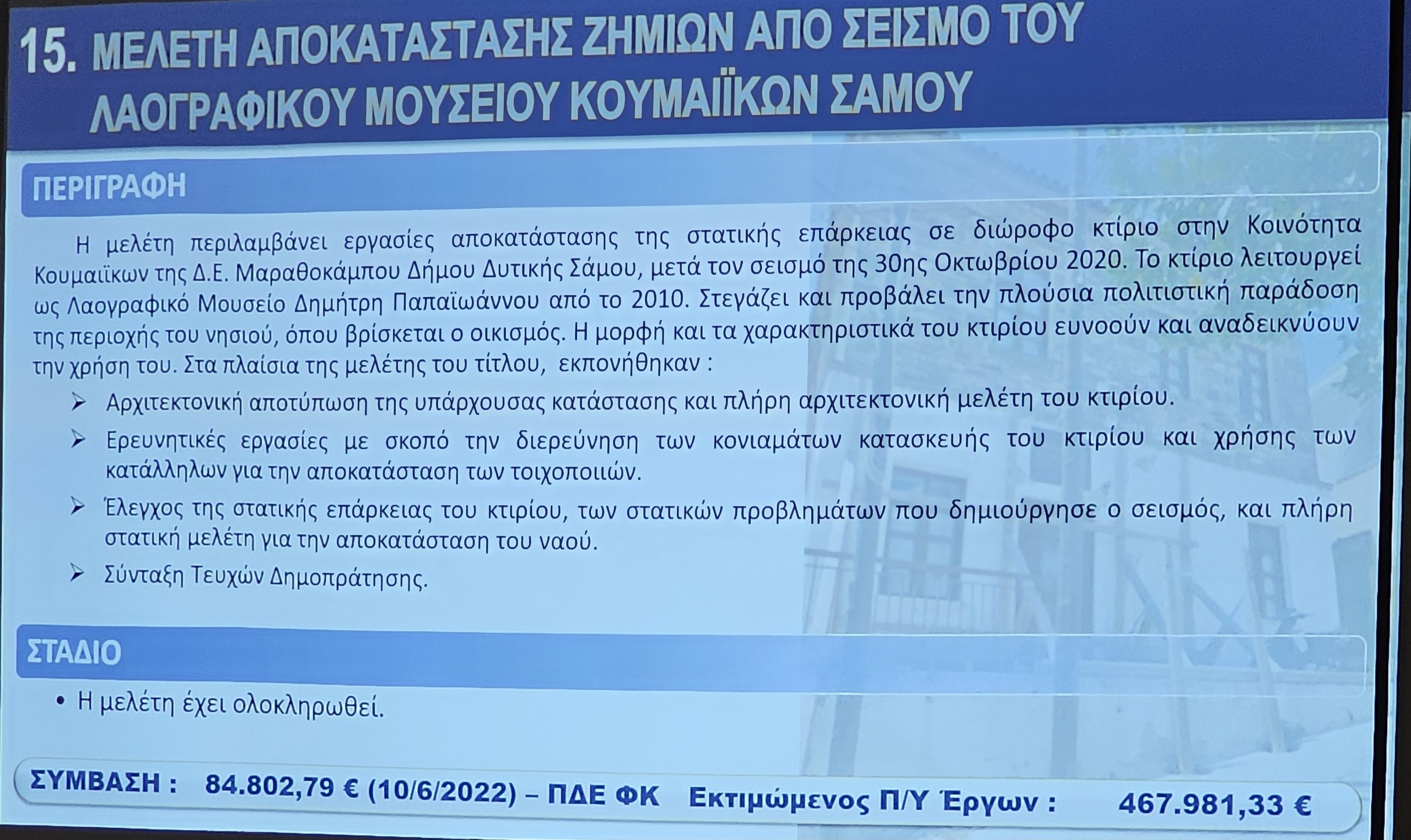 Ο Προϊστάμενος των Τεχνικών Υπηρεσιών Νίκος Ζαφείρης, παρουσίασε τα έργα με έμφαση στη συμβολή τους στην αναπτυξιακή προοπτική της Νήσου Σάμου.