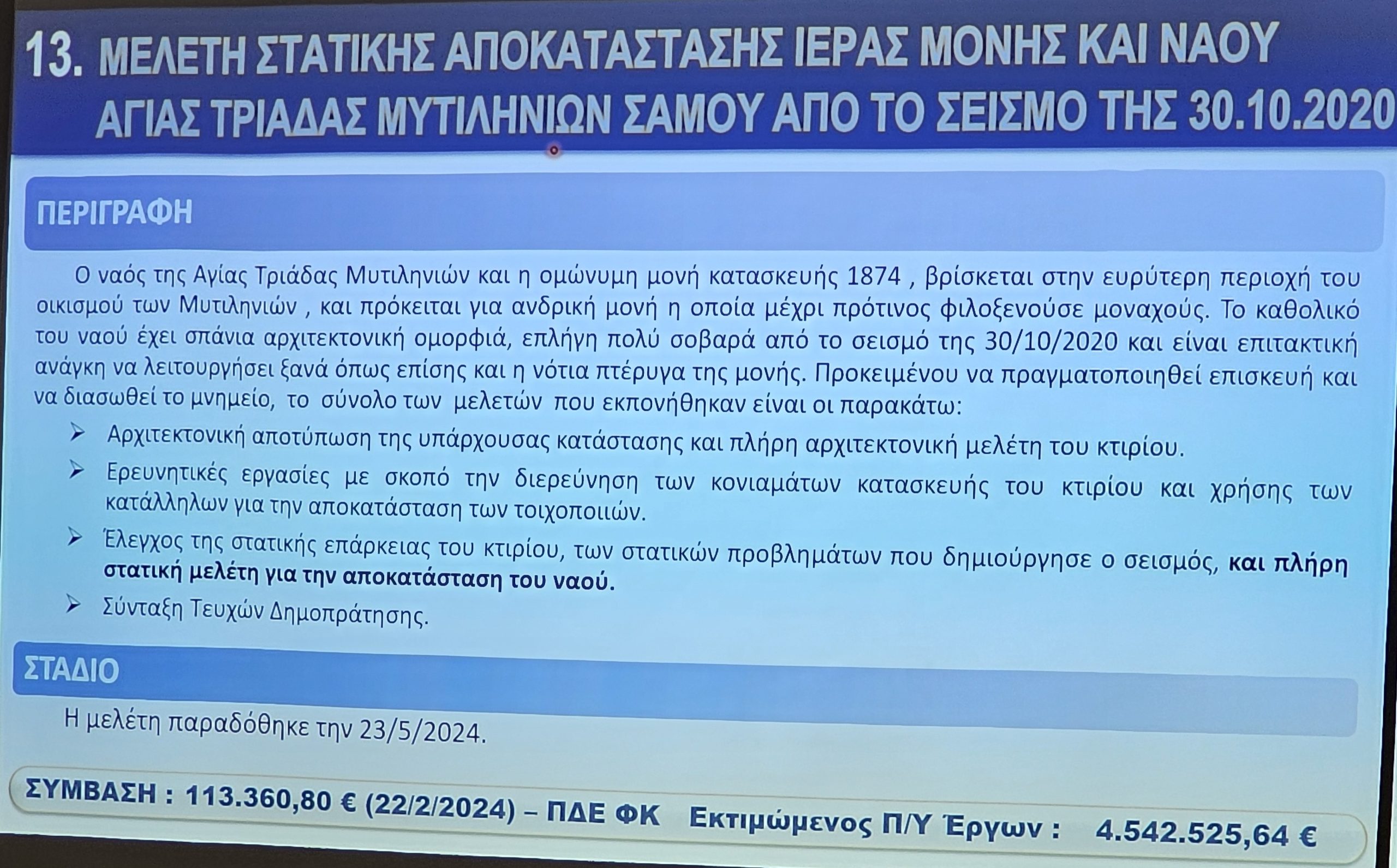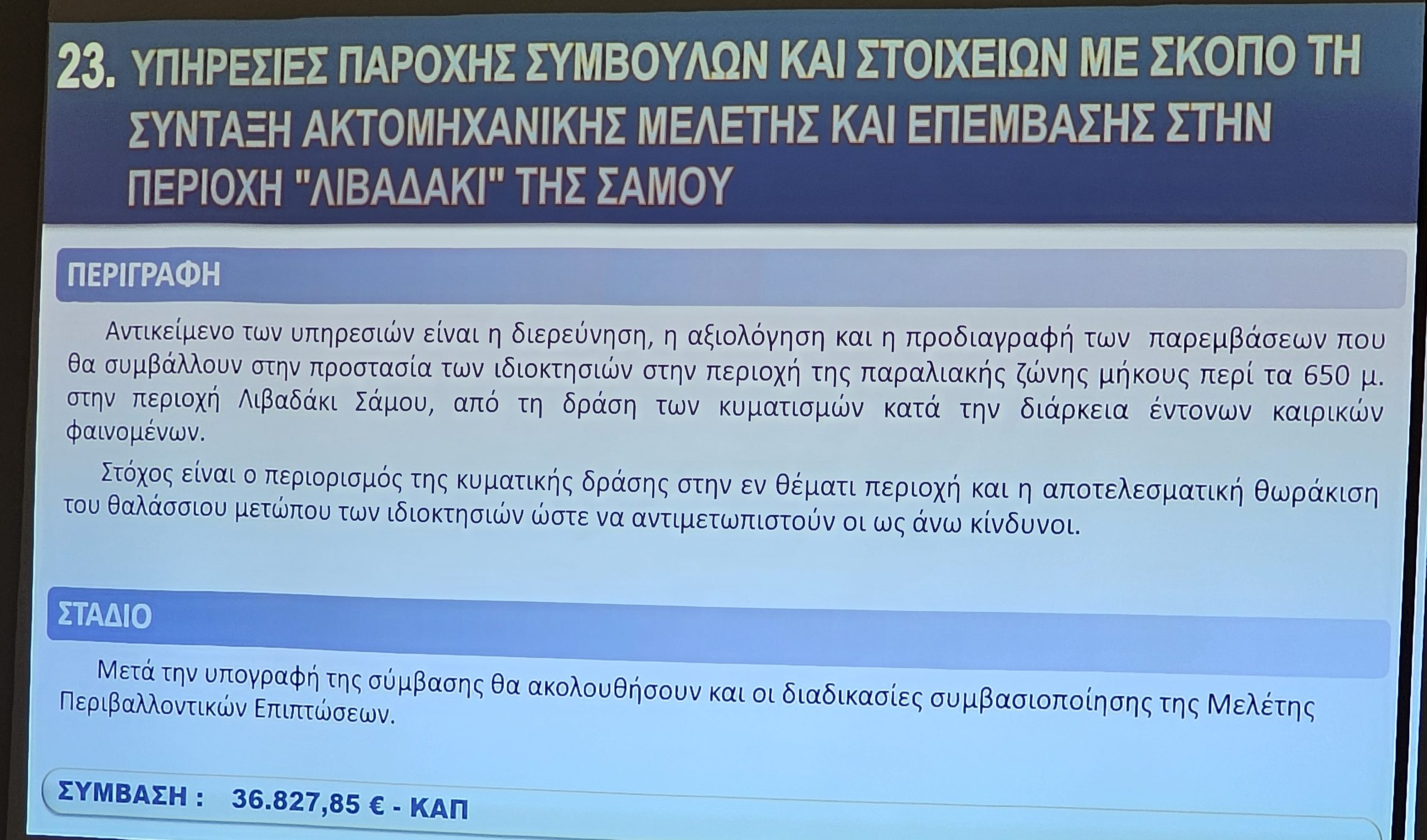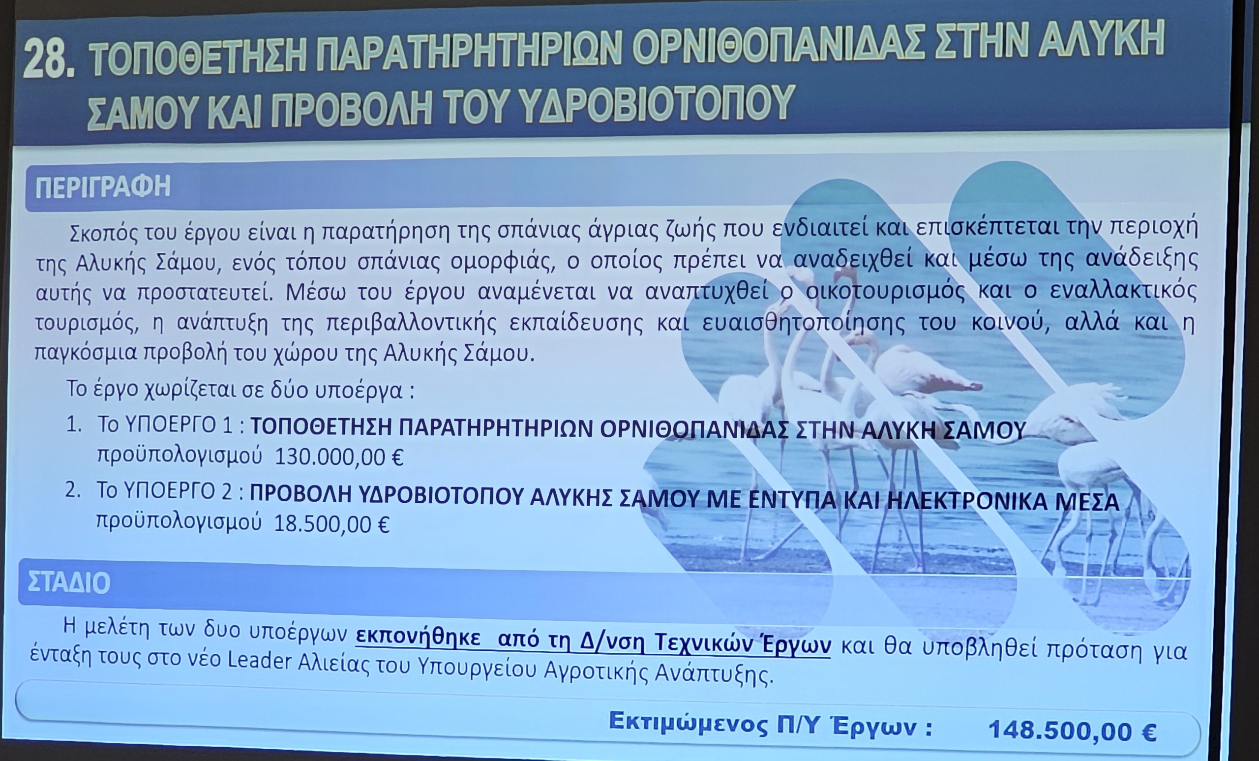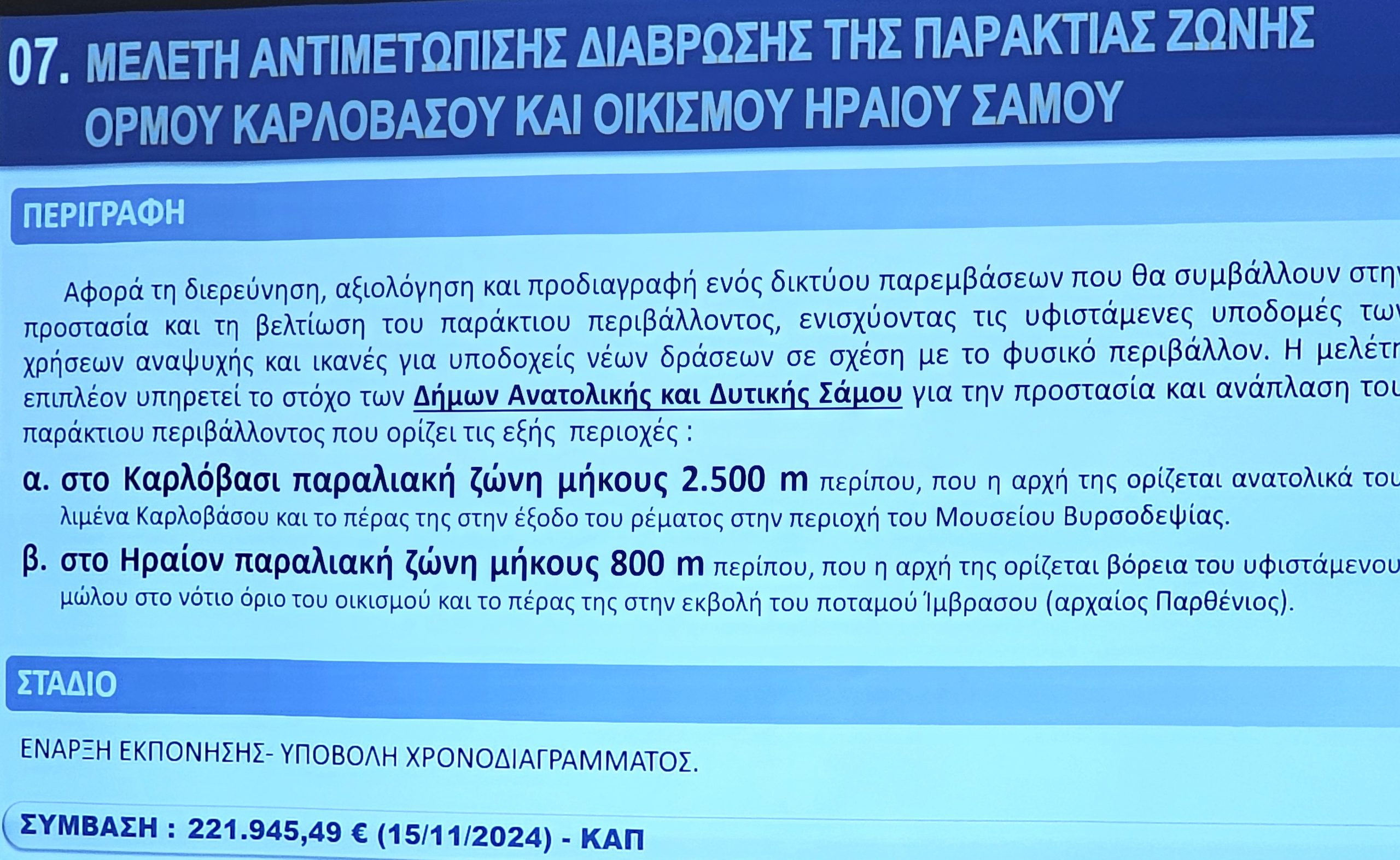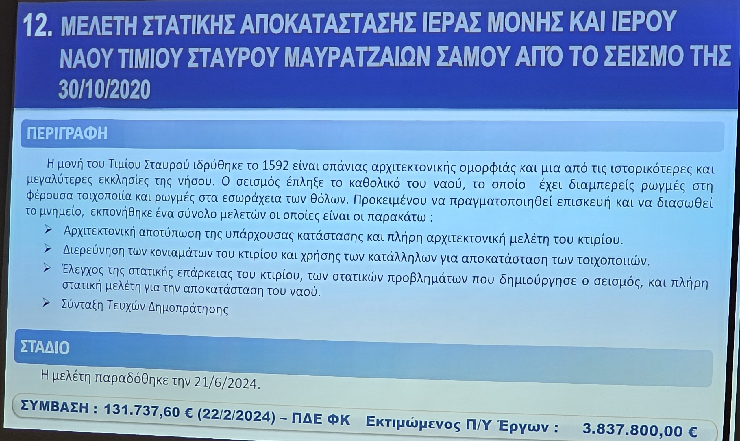Ο Προϊστάμενος των Τεχνικών Υπηρεσιών Νίκος Ζαφείρης, παρουσίασε τα έργα με έμφαση στη συμβολή τους στην αναπτυξιακή προοπτική της Νήσου Σάμου.