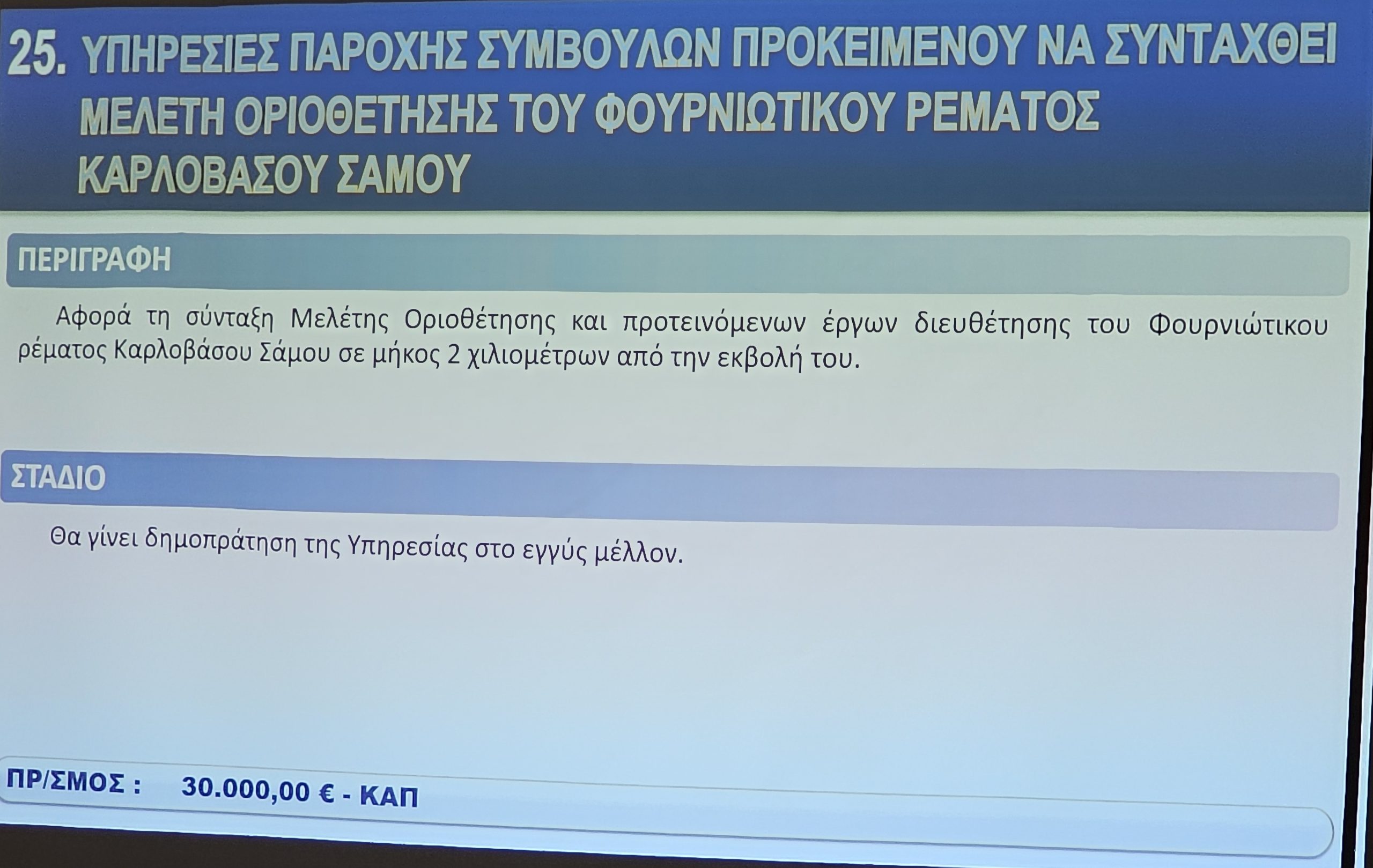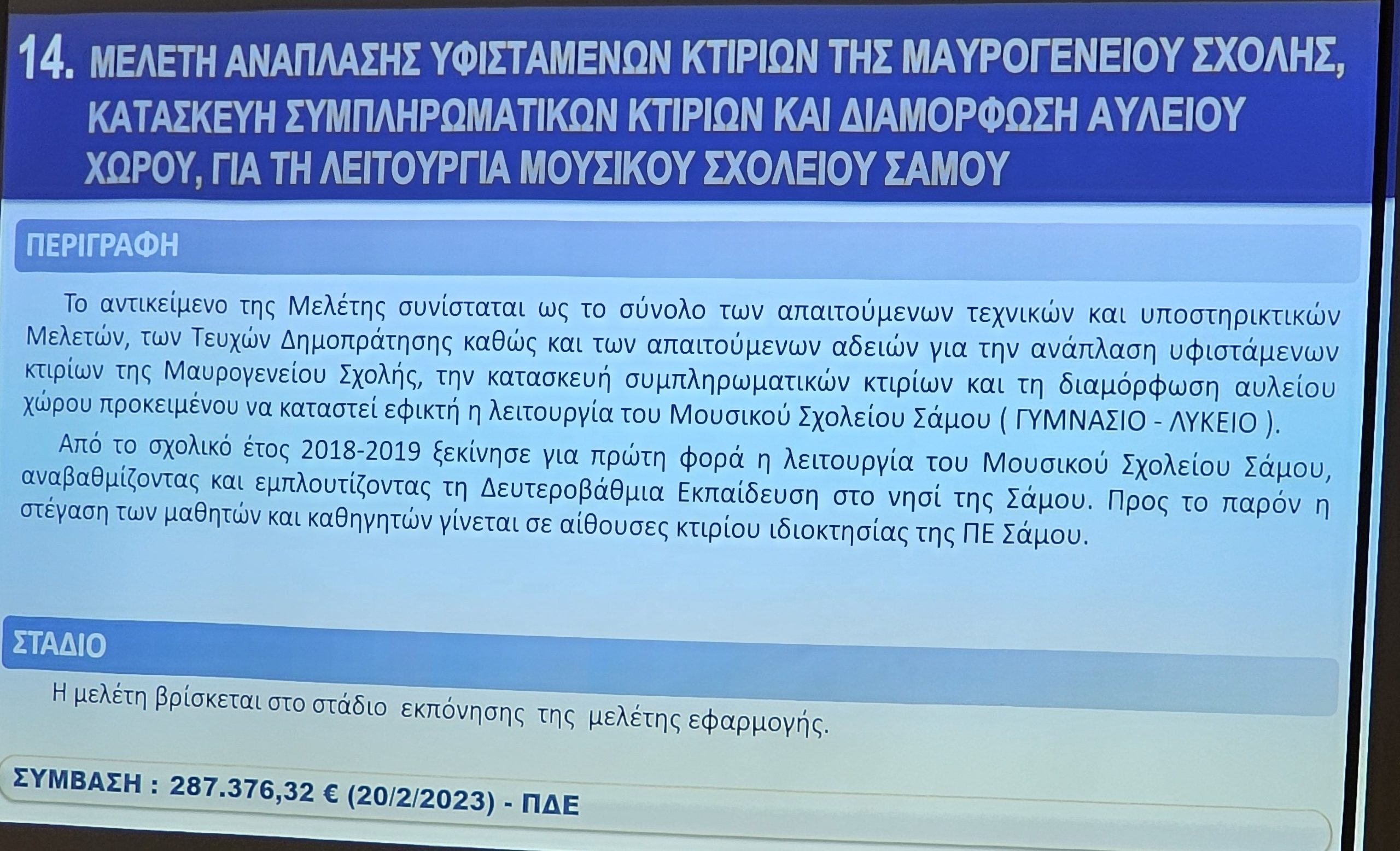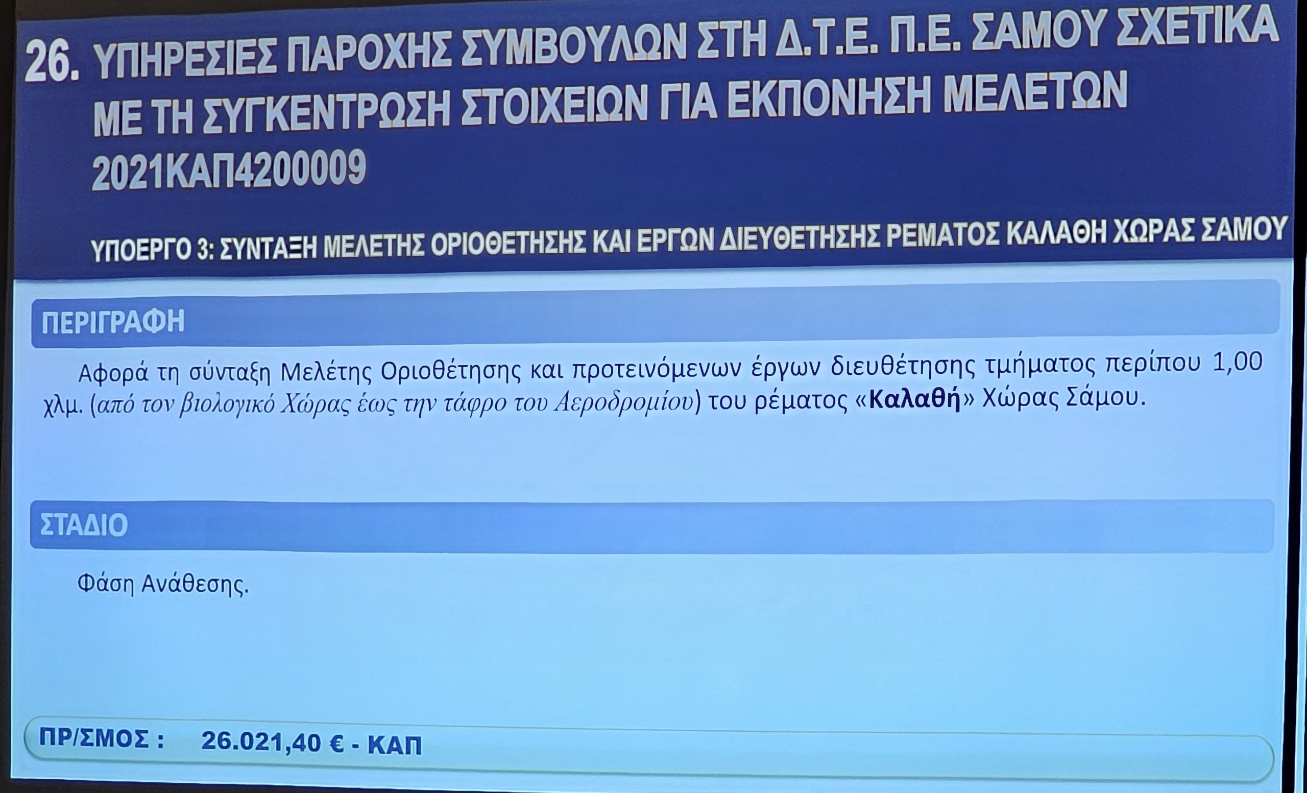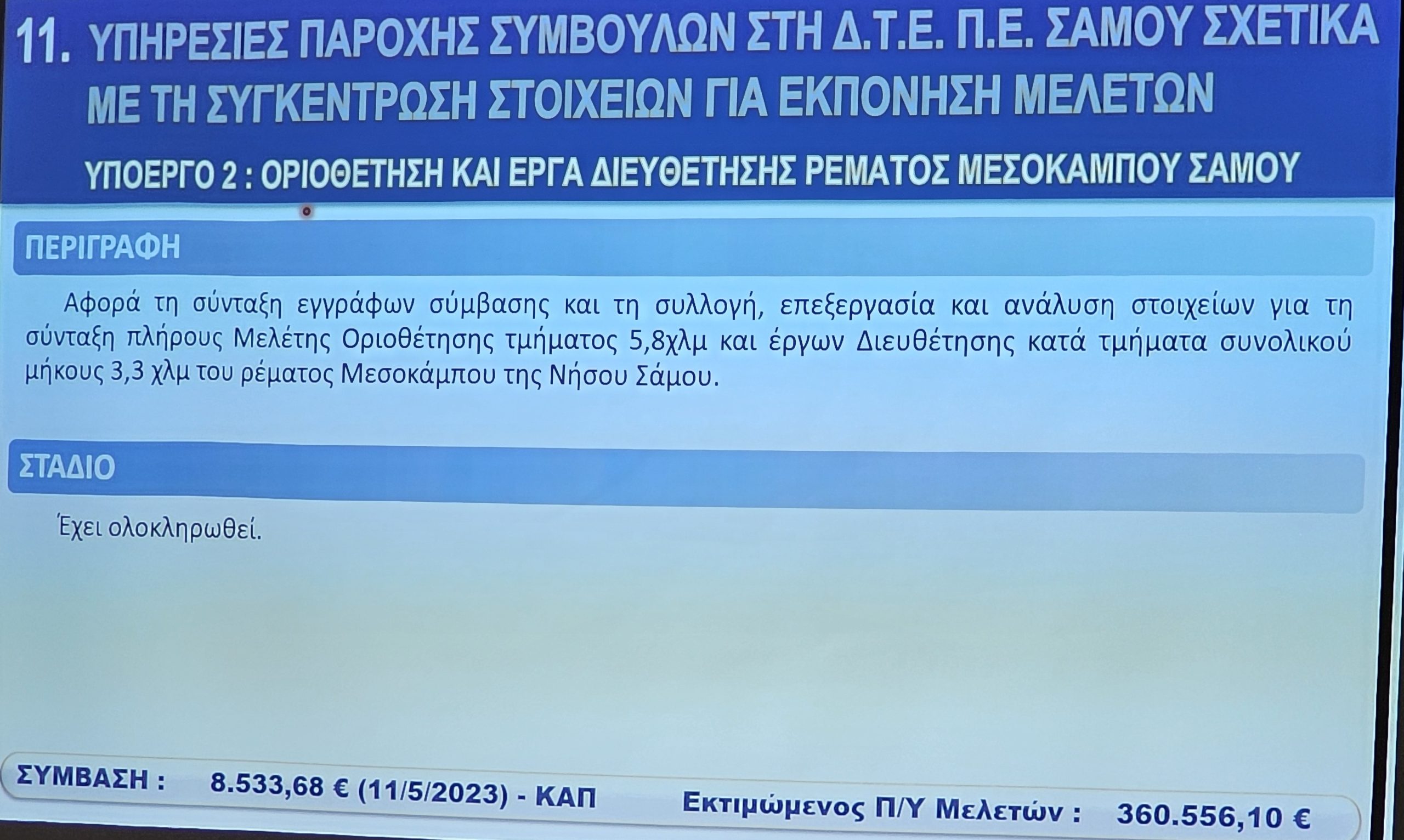 Σε κλίμα συνεργασίας και στρατηγικού σχεδιασμού πραγματοποιήθηκε το μεσημέρι της Παρασκευής 29 Νοεμβρίου η παρουσίαση μελετών για την Περιφερειακή Ενότητα Σάμου στην αίθουσα τηλεδιασκέψεων της ΠΕ Σάμου. Η εκδήλωση οργανώθηκε υπό την αιγίδα της Περιφέρειας Βορείου Αιγαίου, παρουσία του Περιφερειάρχη Κωνσταντίνου Μουτζούρη και του Αντιπεριφερειάρχη Τεχνικών Έργων Χρυσόστομου Χατζηκυριαζή.