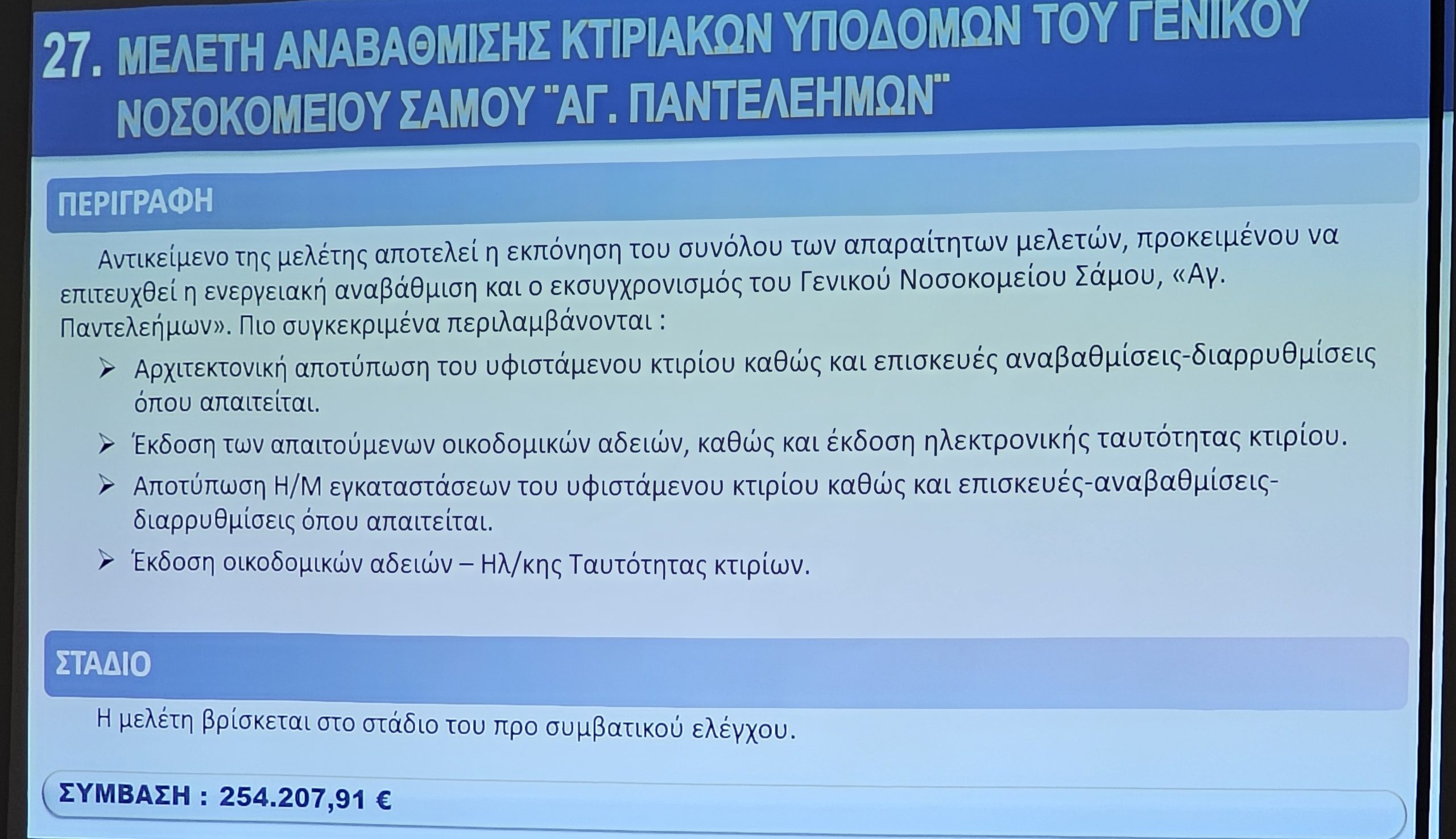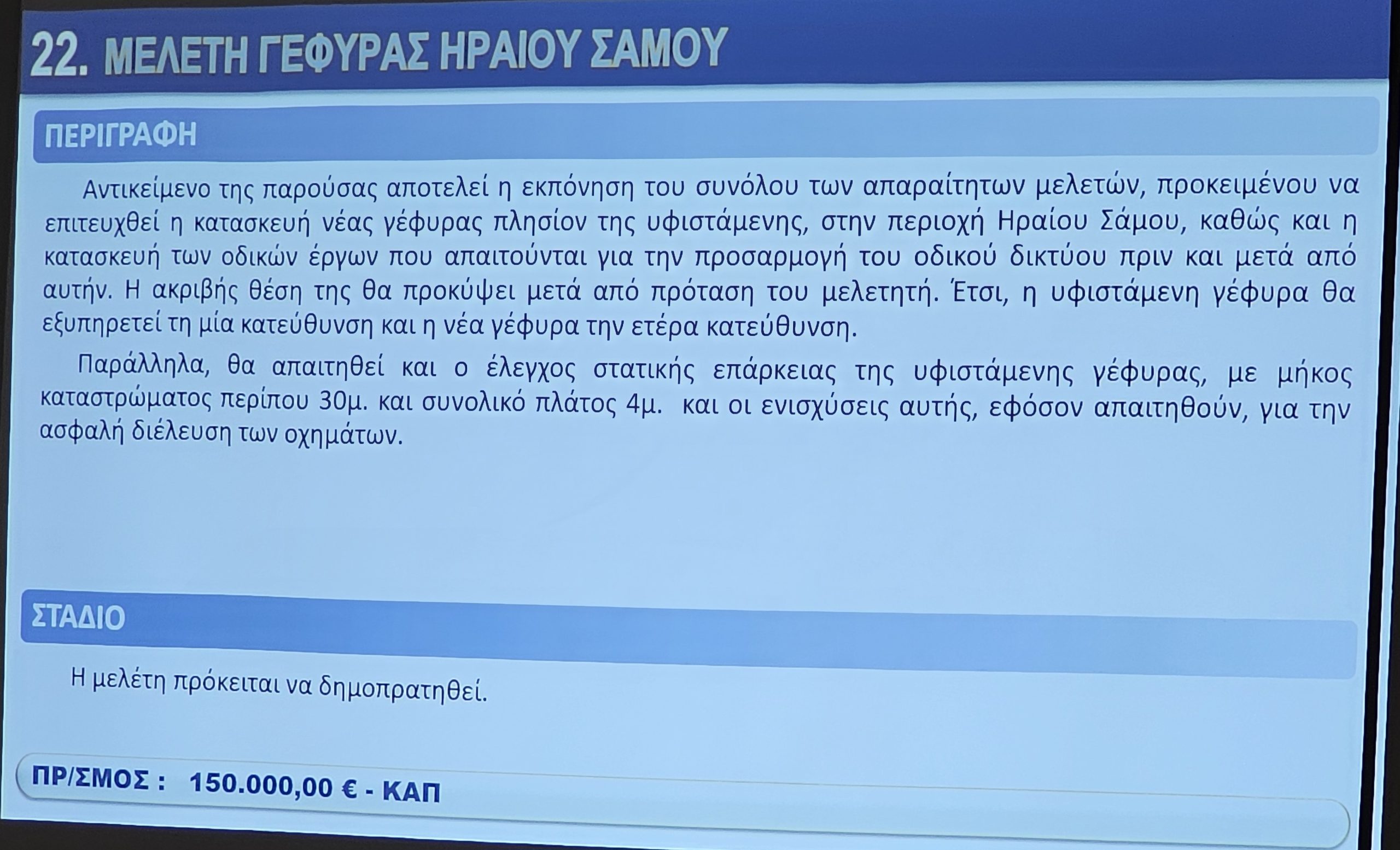 Στη διάρκεια της εκδήλωσης, παρουσιάστηκαν αναλυτικά οι μελέτες που έχουν ήδη εξασφαλίσει χρηματοδότηση, καθώς και οι μελλοντικές που θα χρειαστεί να υλοποιηθούν για την ολοκληρωμένη ανάπτυξη των υποδομών της ΠΕ Σάμου.