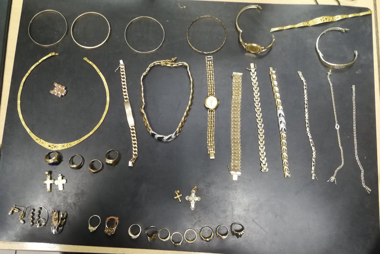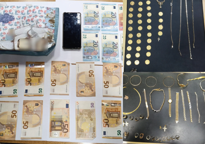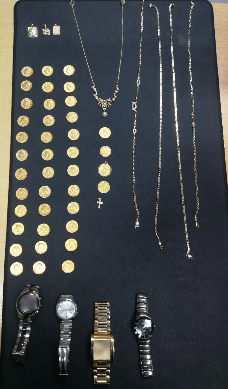 Κατά τη σύλληψη του 52χρονου, βρέθηκαν και κατασχέθηκαν 40 χρυσές λίρες, κοσμήματα και τιμαλφή εκτιμώμενης αξίας 70.000 ευρώ, καθώς και το χρηματικό ποσό των 550 ευρώ. Τα κοσμήματα ανήκαν στην 60χρονη από την οποία είχε αποσπάσει ο 19χρονος τα πολύτιμα αντικείμενα.