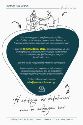 «Το ξενοδοχείο Proteas Blu Resort αναζητά νέους συνεργάτες για την καλοκαιρινή σεζόν 2025, στις παρακάτω θέσεις: