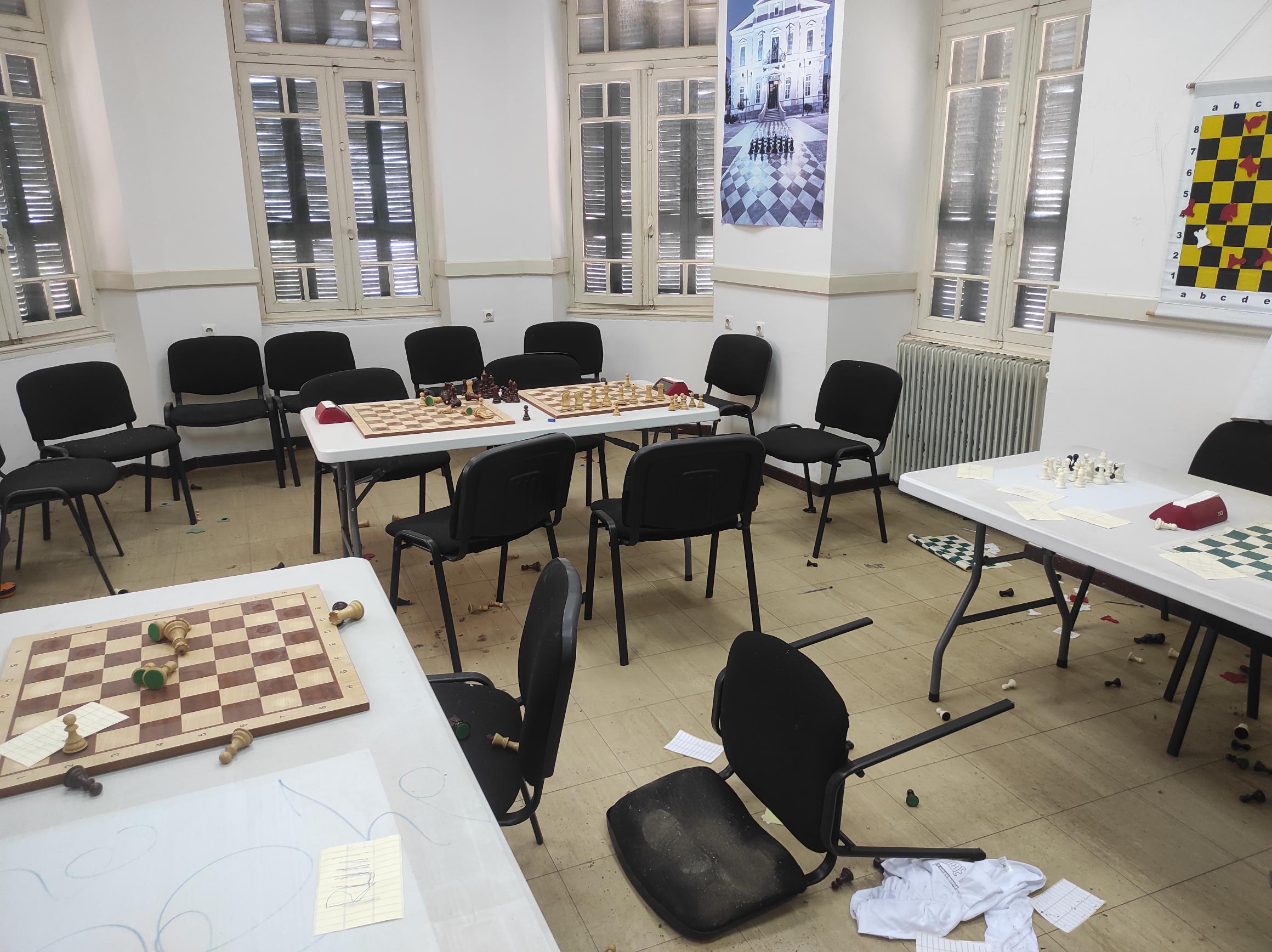 Με μεγάλη θλίψη και αγανάκτηση αντικρίσαμε σήμερα μια παράλογη εικόνα καθώς η αίθουσα που χρησιμοποιεί ο Όμιλός μας στο Βαθύ έγινε στόχος βάνδαλων που προξένησαν σημαντικές φθορές τόσο στο κτήριο όσο και στο σκακιστικό υλικό του Ομίλου μας.