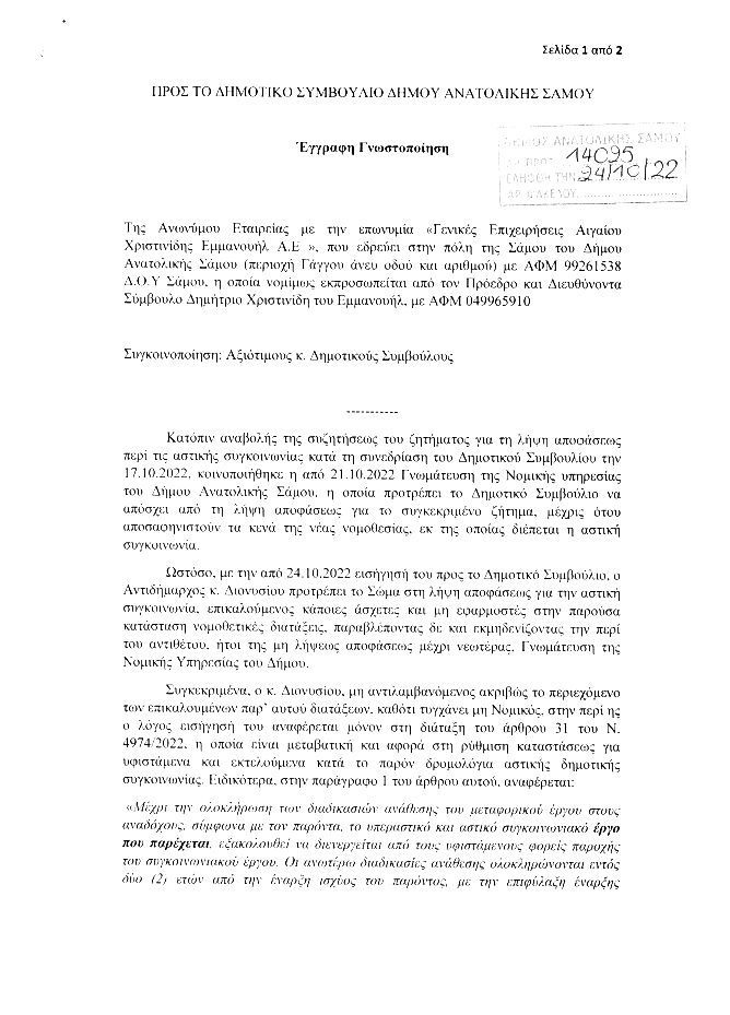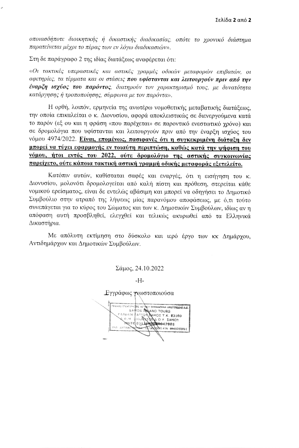 Οι δημοτικές παρατάξεις ”Ολοι μαζί για την Σάμο” του κ. Νίκου Κατρακάζου και η “Ανατροπή” του κ. Χρήστου Χατζηχριστοδούλου, ήταν υπέρ της εισήγησης του Νομικού Συμβούλου του Δήμου η οποία ήταν η εξης:
