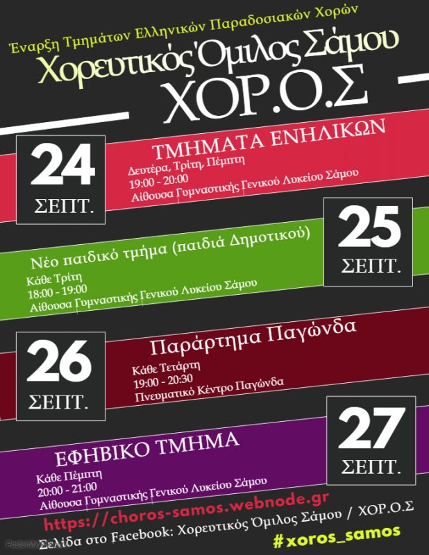 Ο Χορευτικός Όμιλος Σάμου – ΧΟΡ.Ο.Σ σας προσκαλεί στα Τμήματα Ελληνικών Παραδοσιακών Χορών για μία ακόμη χρονιά.