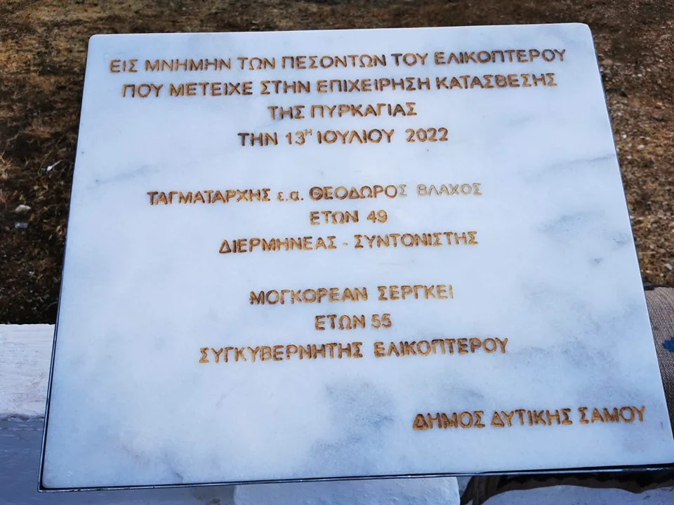 Με πρωτοβουλία του Δήμου Δυτικής Σάμου την Κυριακή 16 Ιουλίου 2023 στις 11 πρωί στο παρεκκλήσι του Αγίου Μηνά – Πλάκας Μαραθοκάμπου θα τελεστεί επιμνημόσυνη δέηση στη μνήμη των δύο αδικοχαμένων ανδρών, του απόστρατου της Αεροπορίας Στρατού, Θεόδωρου Βλάχου και του συγκυβερνήτη του ελικοπτέρου Μογκόρεαν Σεργκέι που έχασαν τη ζωή τους κατά την πτώση του στις 13 Ιουλίου, στην προσπάθεια κατάσβεσης πυρκαγιάς που εκδηλώθηκε στη περιοχή.