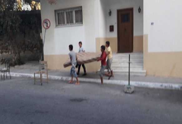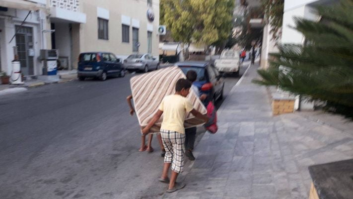 Σήμερα το απόγευμα γύρω στις 6:20 κοντά στα κεντρικά γραφεία της Cosmote στη πόλη της Σάμου, τέσσερα παιδάκια  που διαμένουν στο κέντρο μεταναστών Σάμου,έκαναν απέλπιδες προσπάθειες να σηκώσουν ένα μεταχειρισμένο στρώμα που κάποιος κάτοικος το είχε εναποθέσει σε κοντινό κάδο σκουπιδιών .