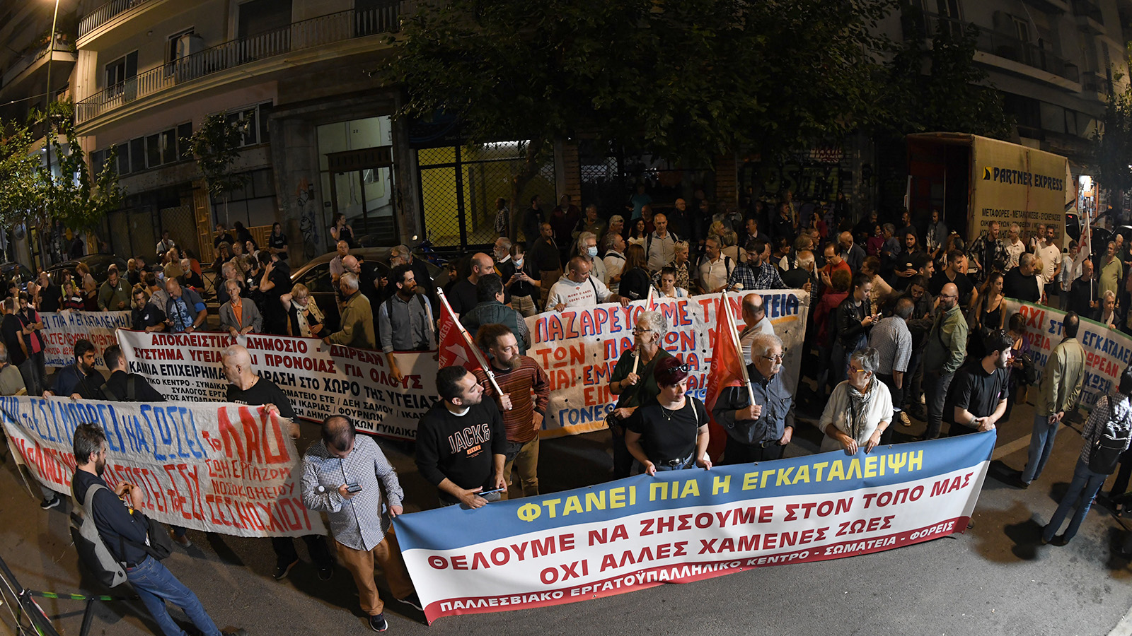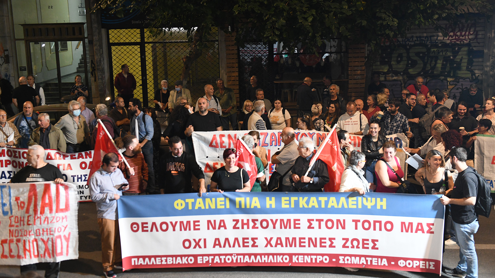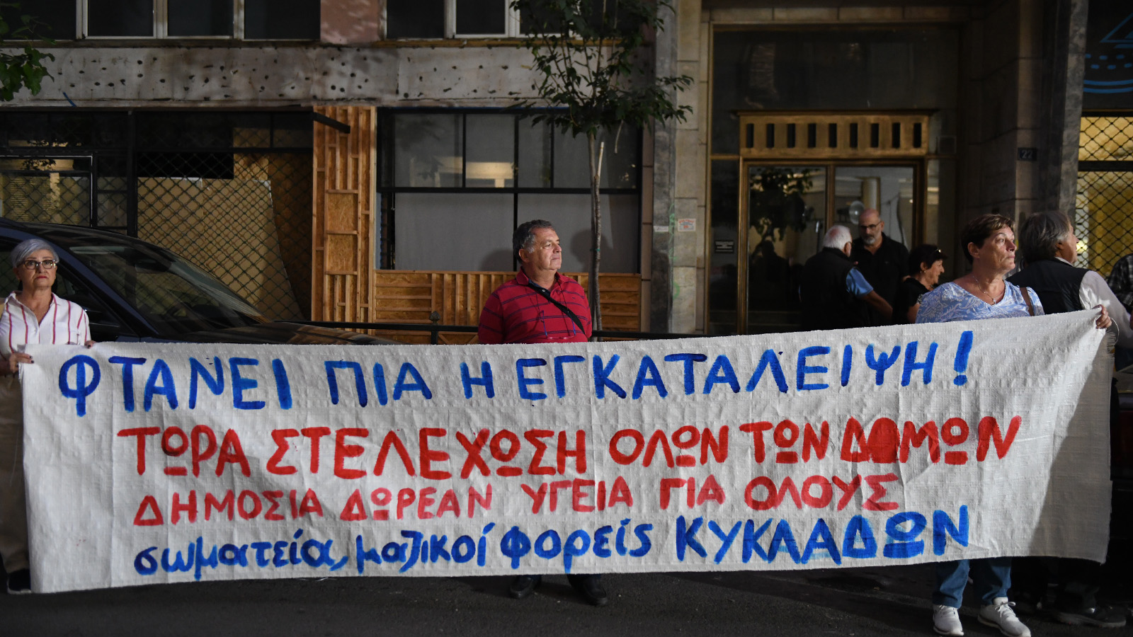 Τέρμα πια στην υποβάθμιση, εδώ και τώρα στελέχωση και χρηματοδότηση νοσοκομείων και Κέντρων Υγείας» το σύνθημα της κινητοποίησης που διοργανώνουν αυτή την ώρα νησιώτες του Αιγαίου, έξω από το υπουργείο Υγείας.